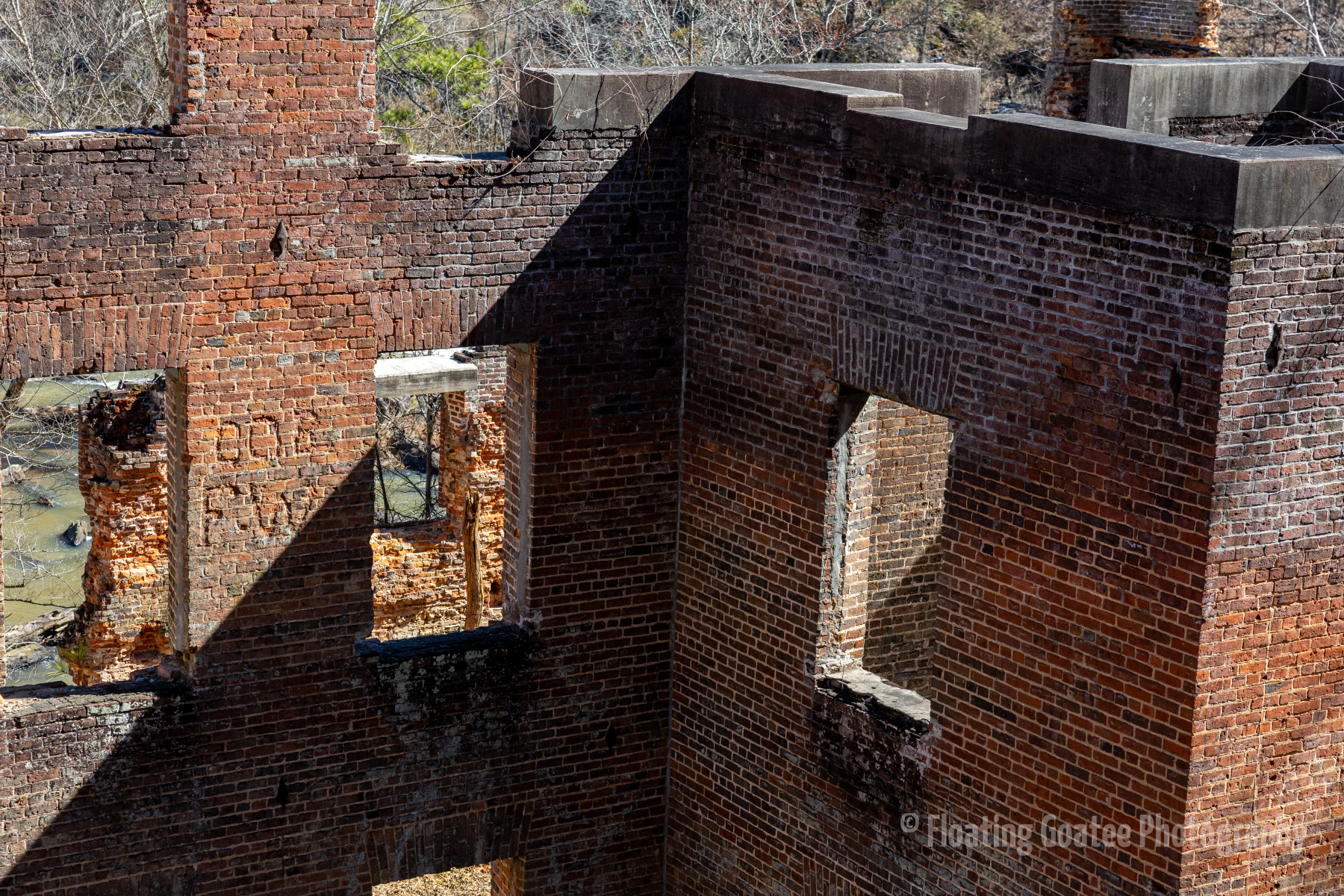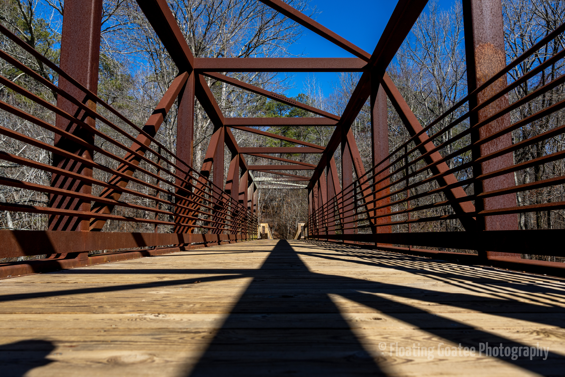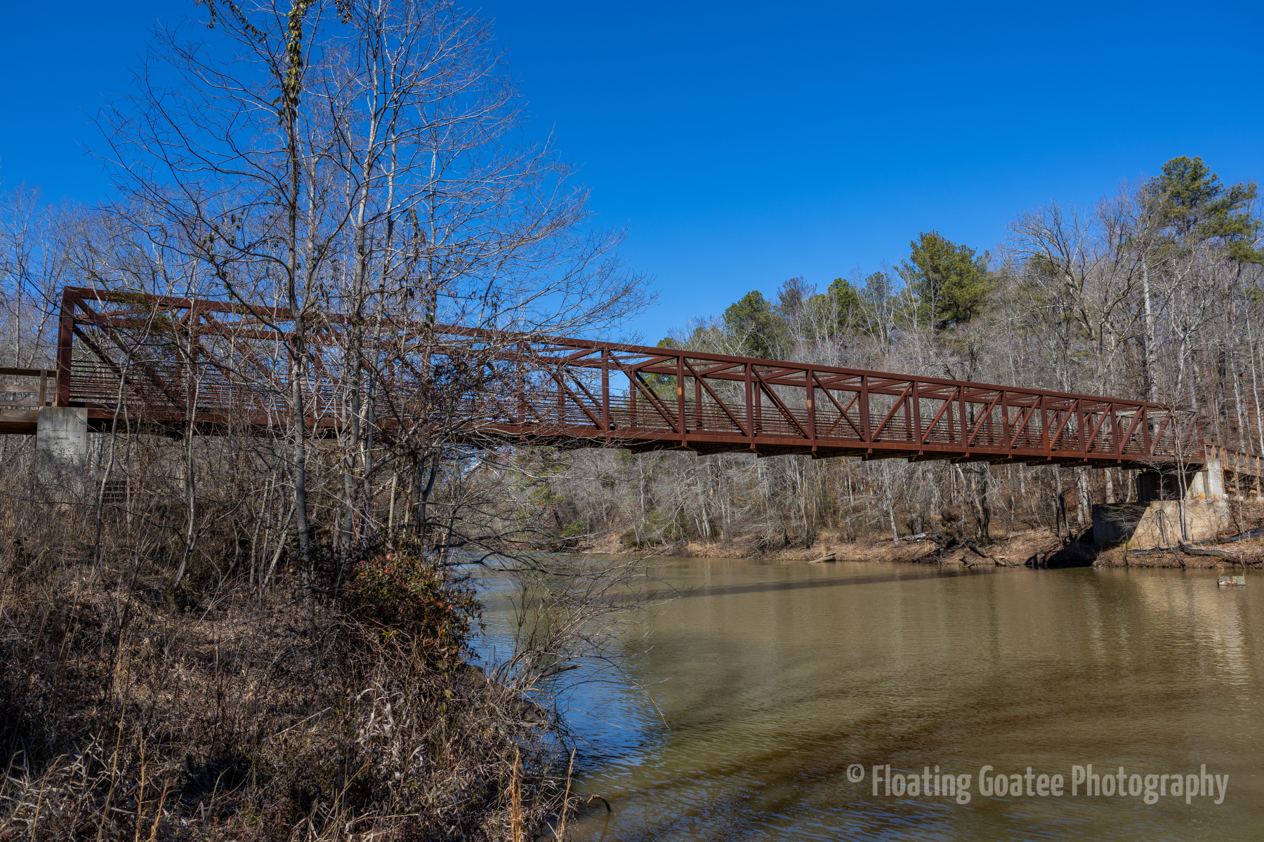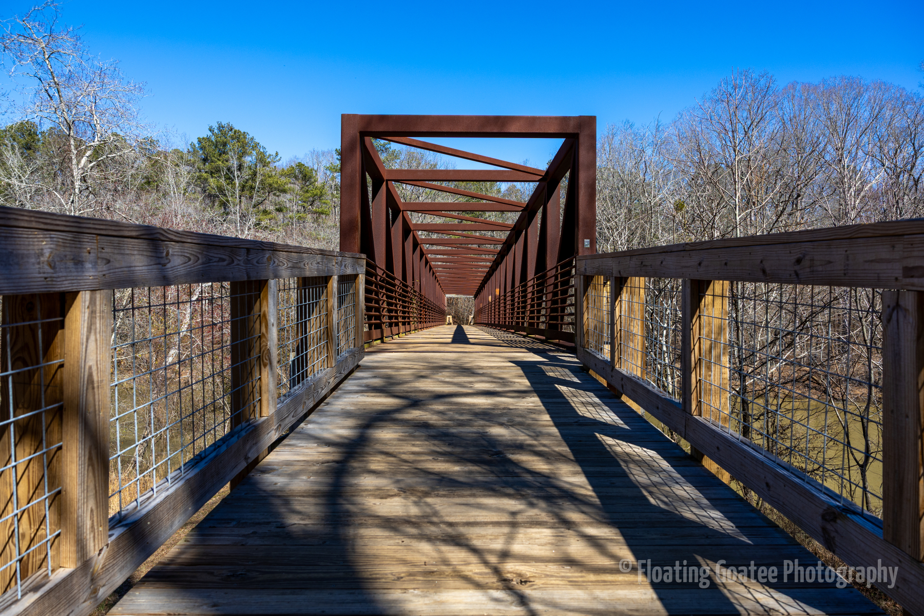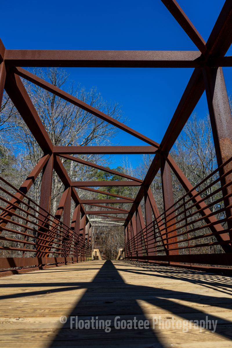 The historic property burned to the ground during the Civil War outside Atlanta. Ruins attract visitors, movies, and television. A rough set of trails and a creek with mild rapids. A pedestrian bridge that spans a wide section of the creek. Some come for the ruins, but the bridge is what captured my attention.