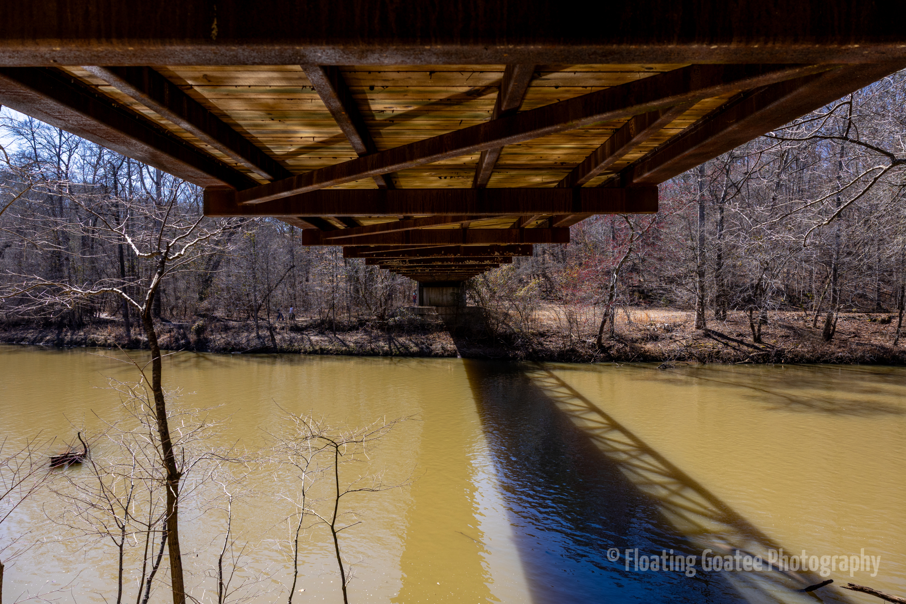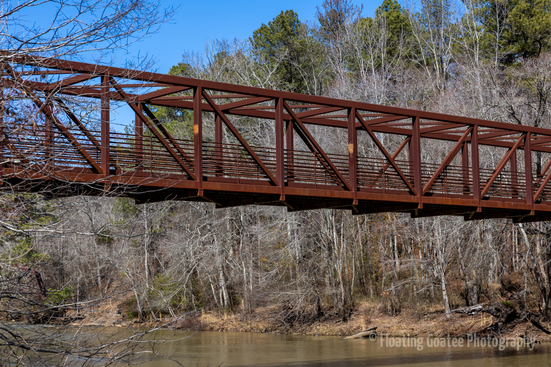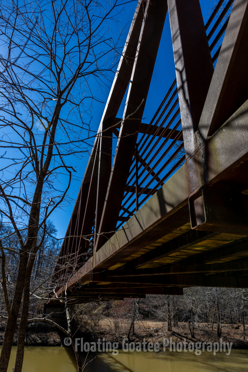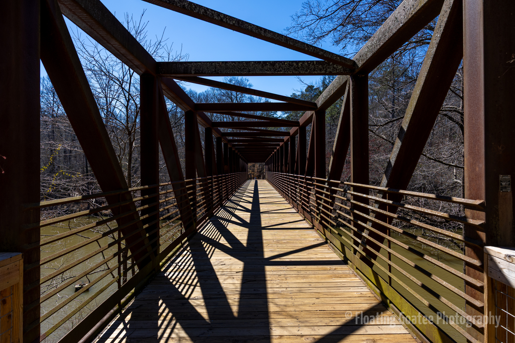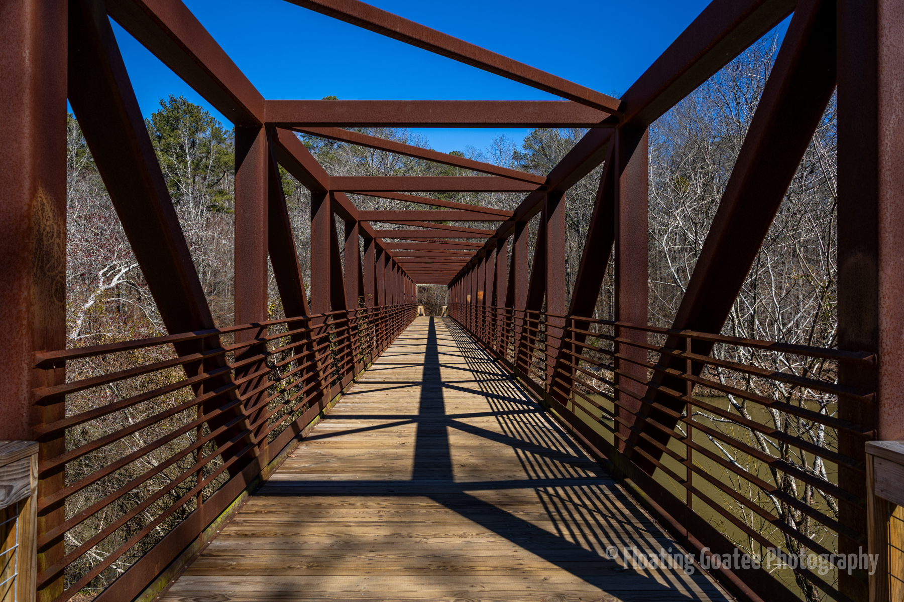 The historic property burned to the ground during the Civil War outside Atlanta. Ruins attract visitors, movies, and television. A rough set of trails and a creek with mild rapids. A pedestrian bridge that spans a wide section of the creek. Some come for the ruins, but the bridge is what captured my attention.