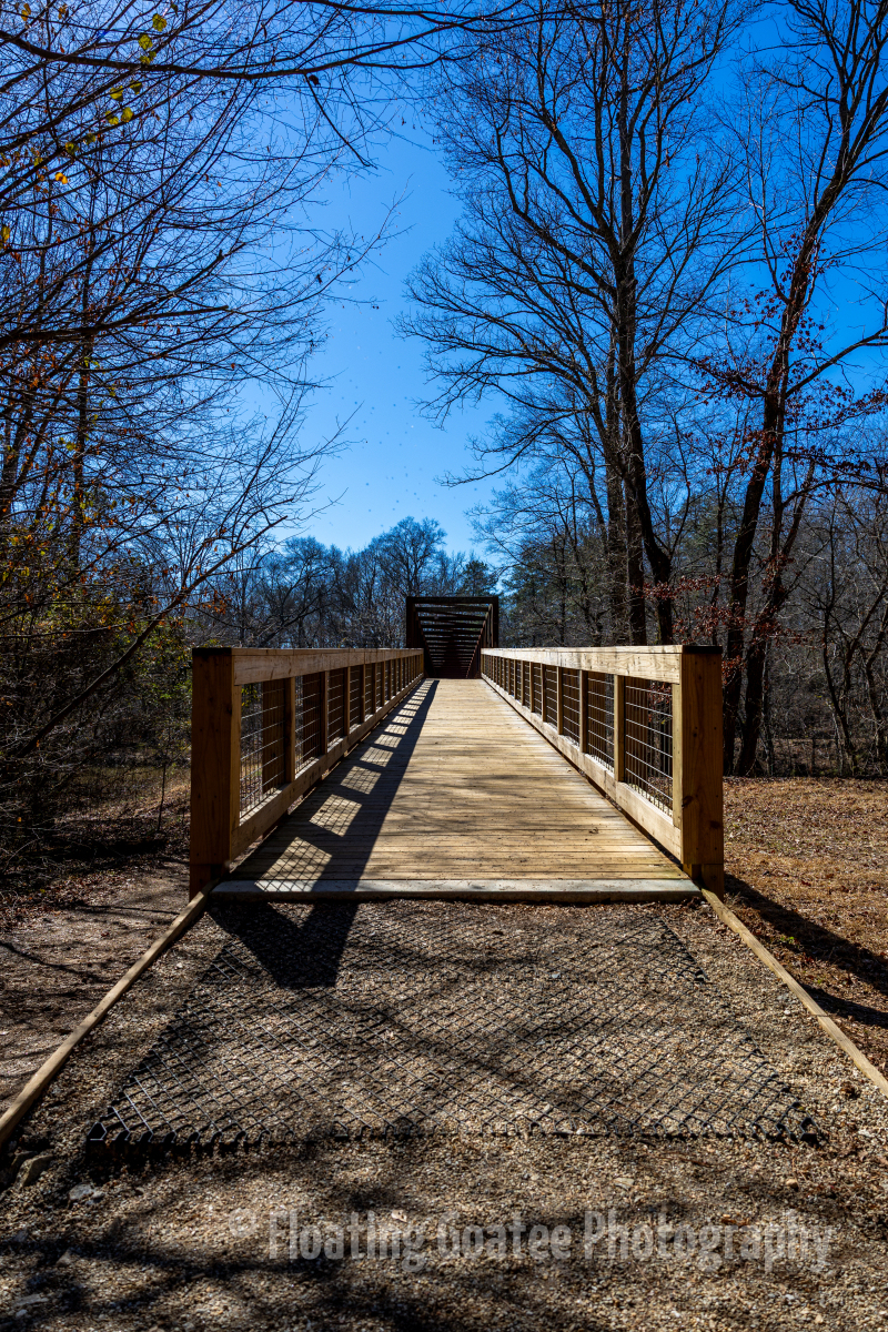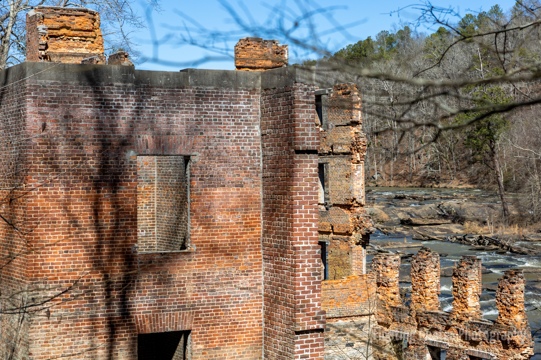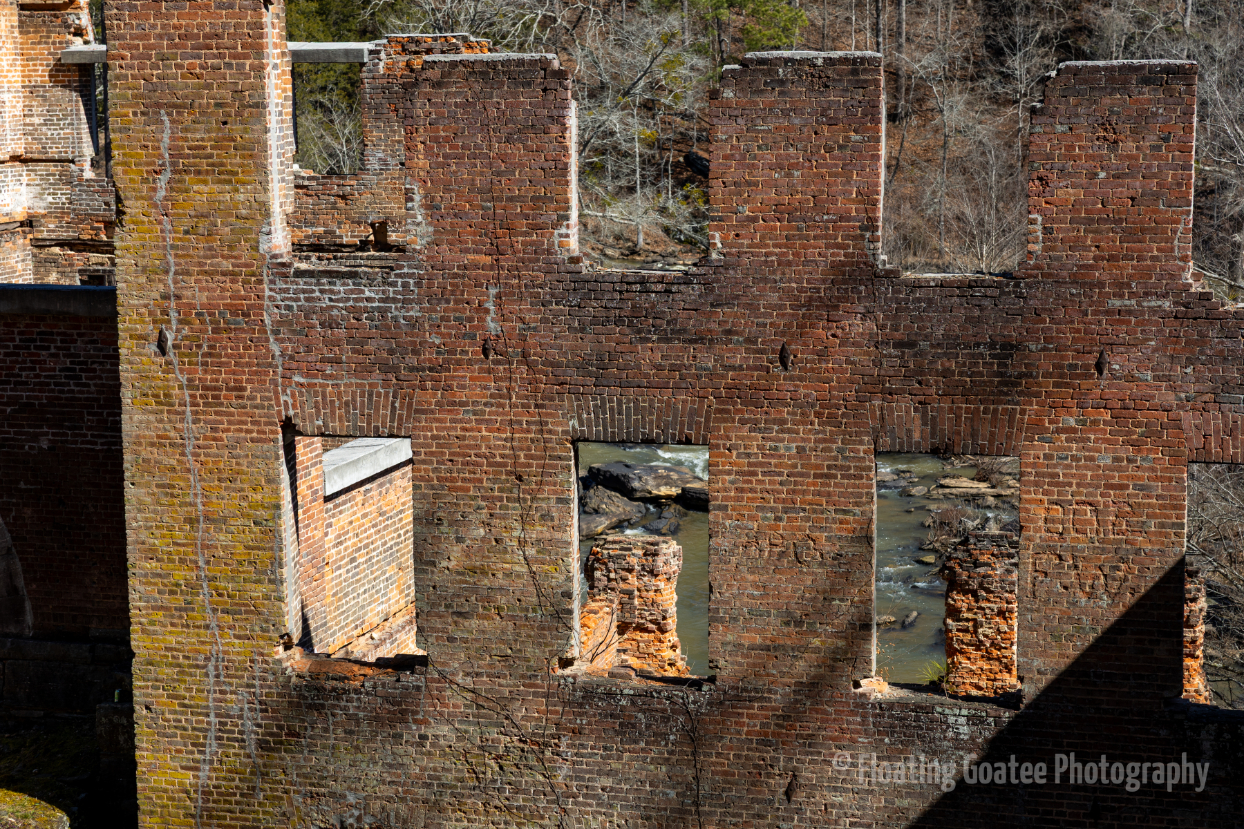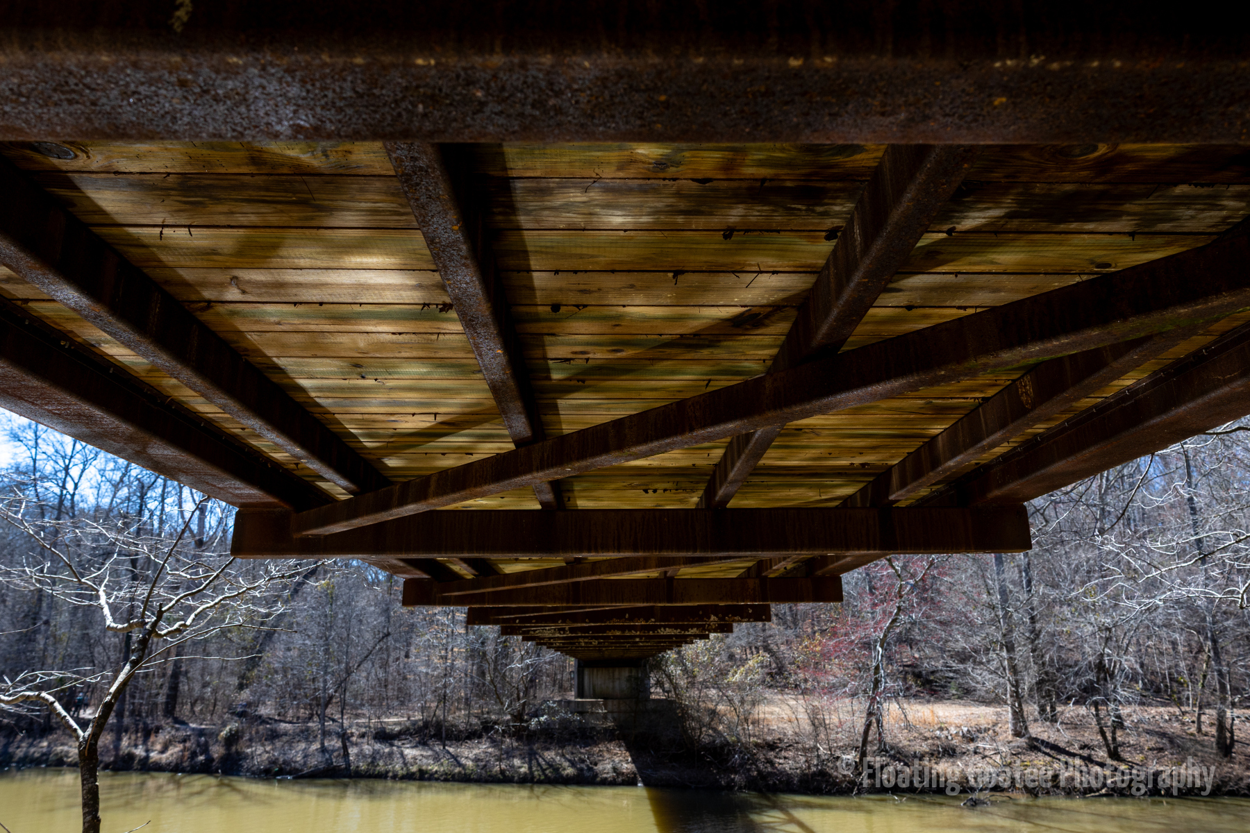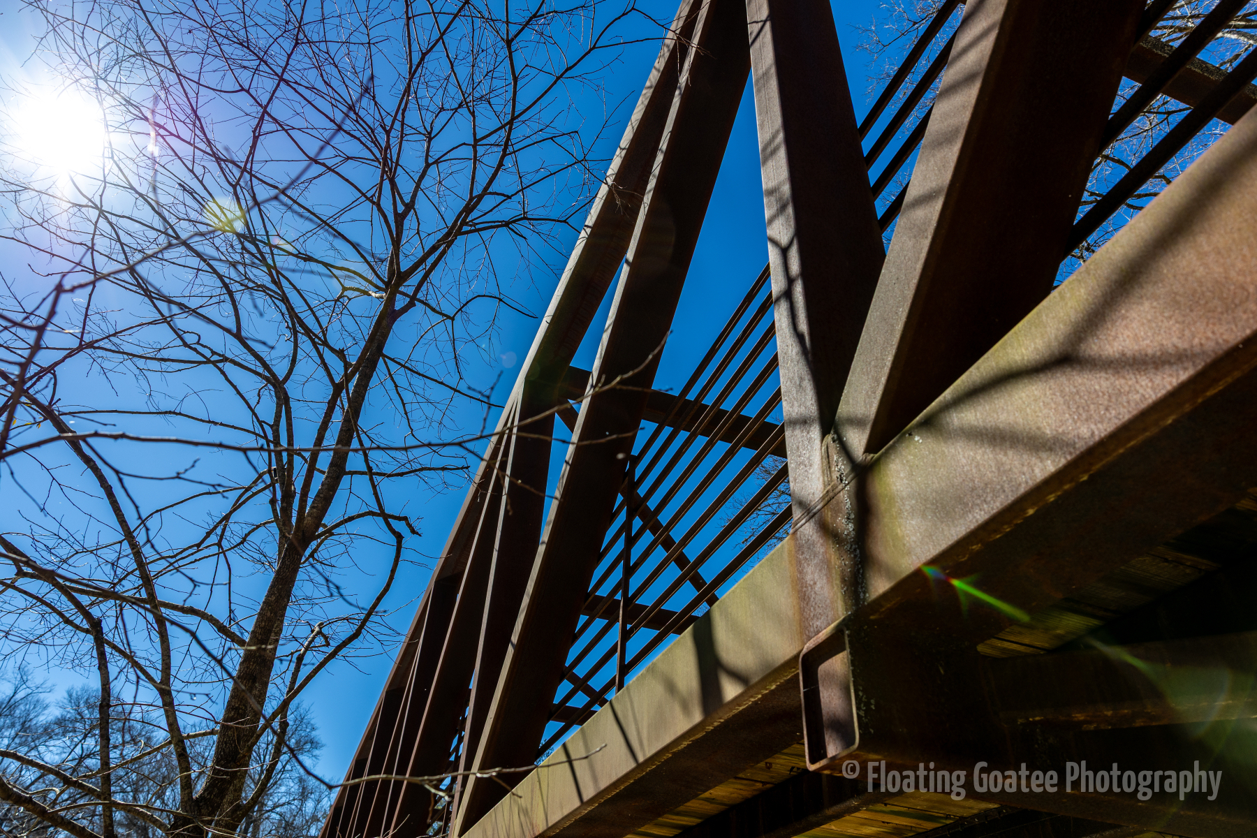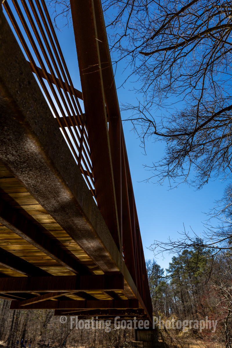 The historic property burned to the ground during the Civil War outside Atlanta. Ruins attract visitors, movies, and television. A rough set of trails and a creek with mild rapids. A pedestrian bridge that spans a wide section of the creek. Some come for the ruins, but the bridge is what captured my attention.