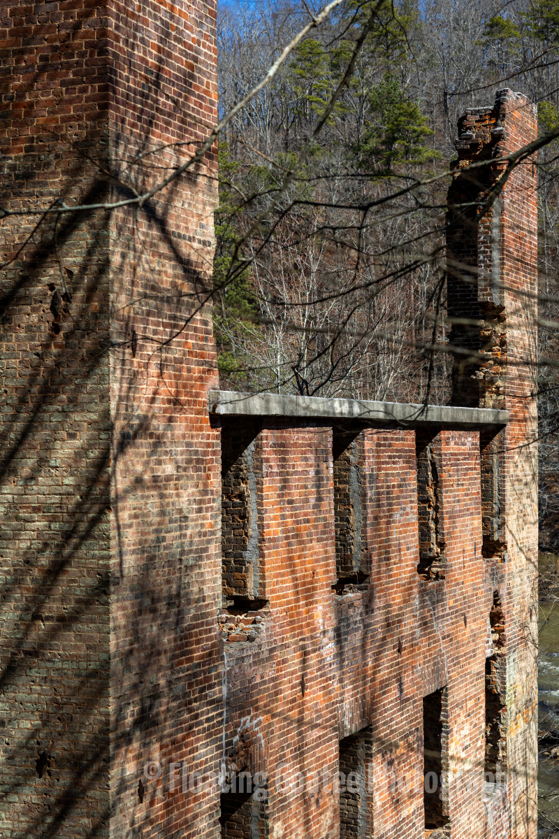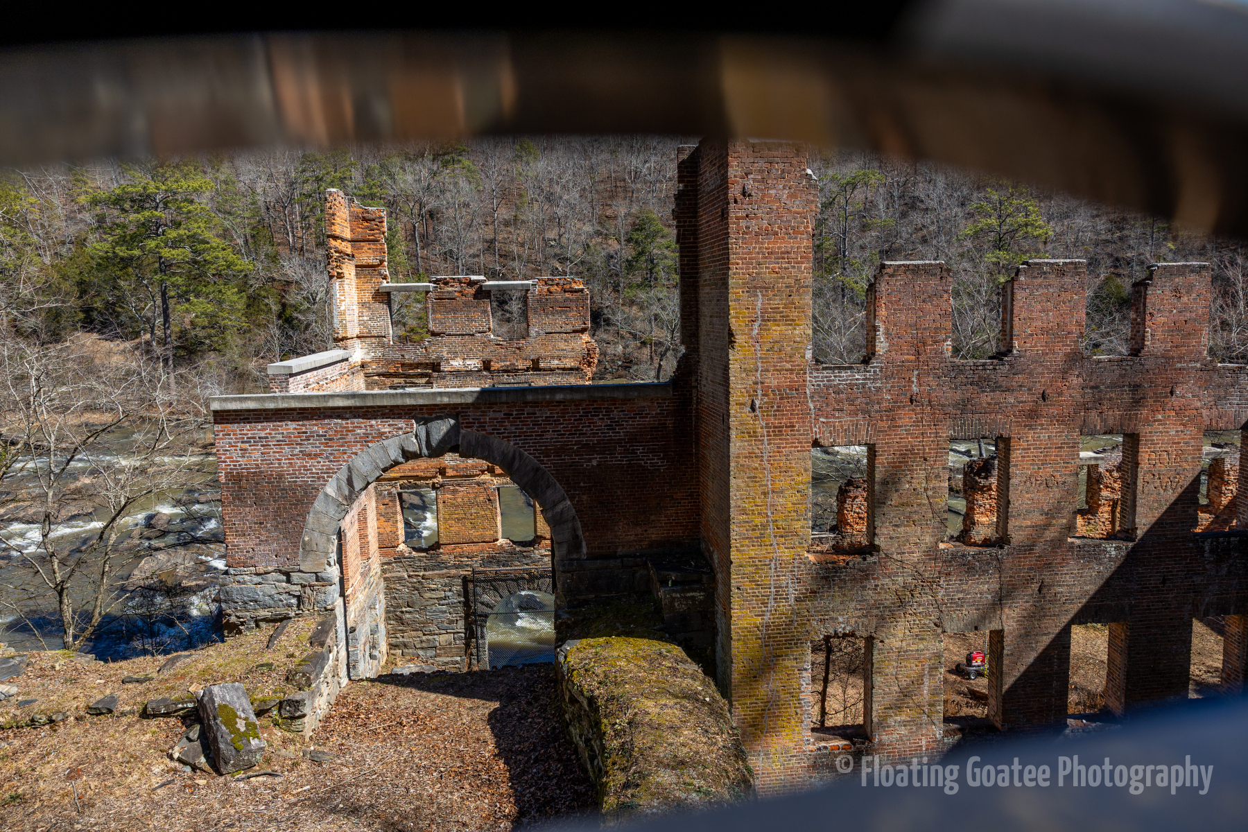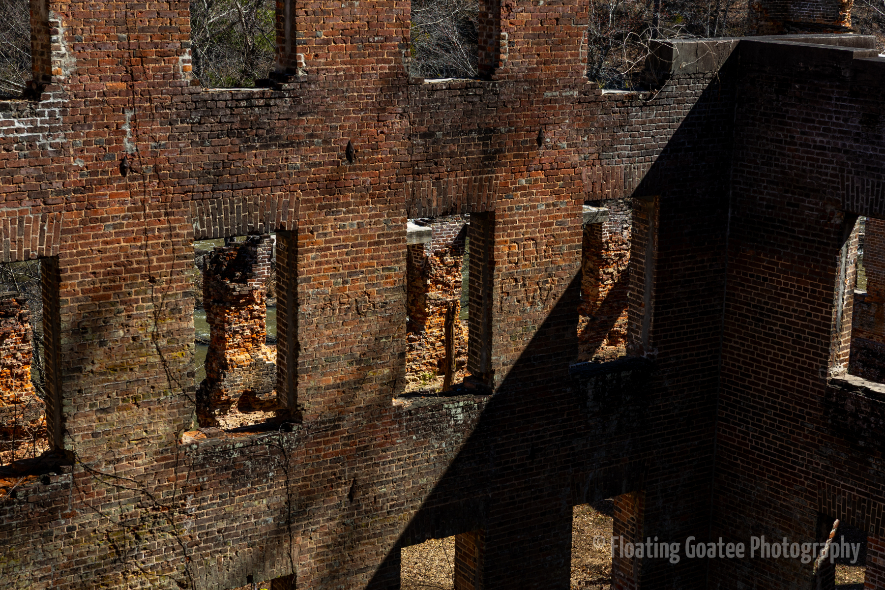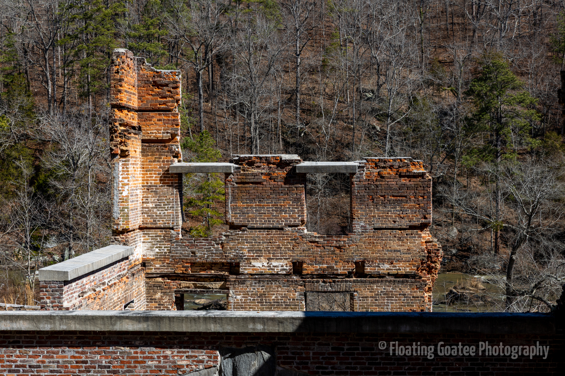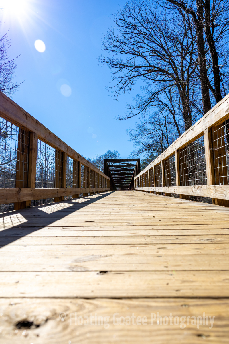 The historic property burned to the ground during the Civil War outside Atlanta. Ruins attract visitors, movies, and television. A rough set of trails and a creek with mild rapids. A pedestrian bridge that spans a wide section of the creek. Some come for the ruins, but the bridge is what captured my attention.