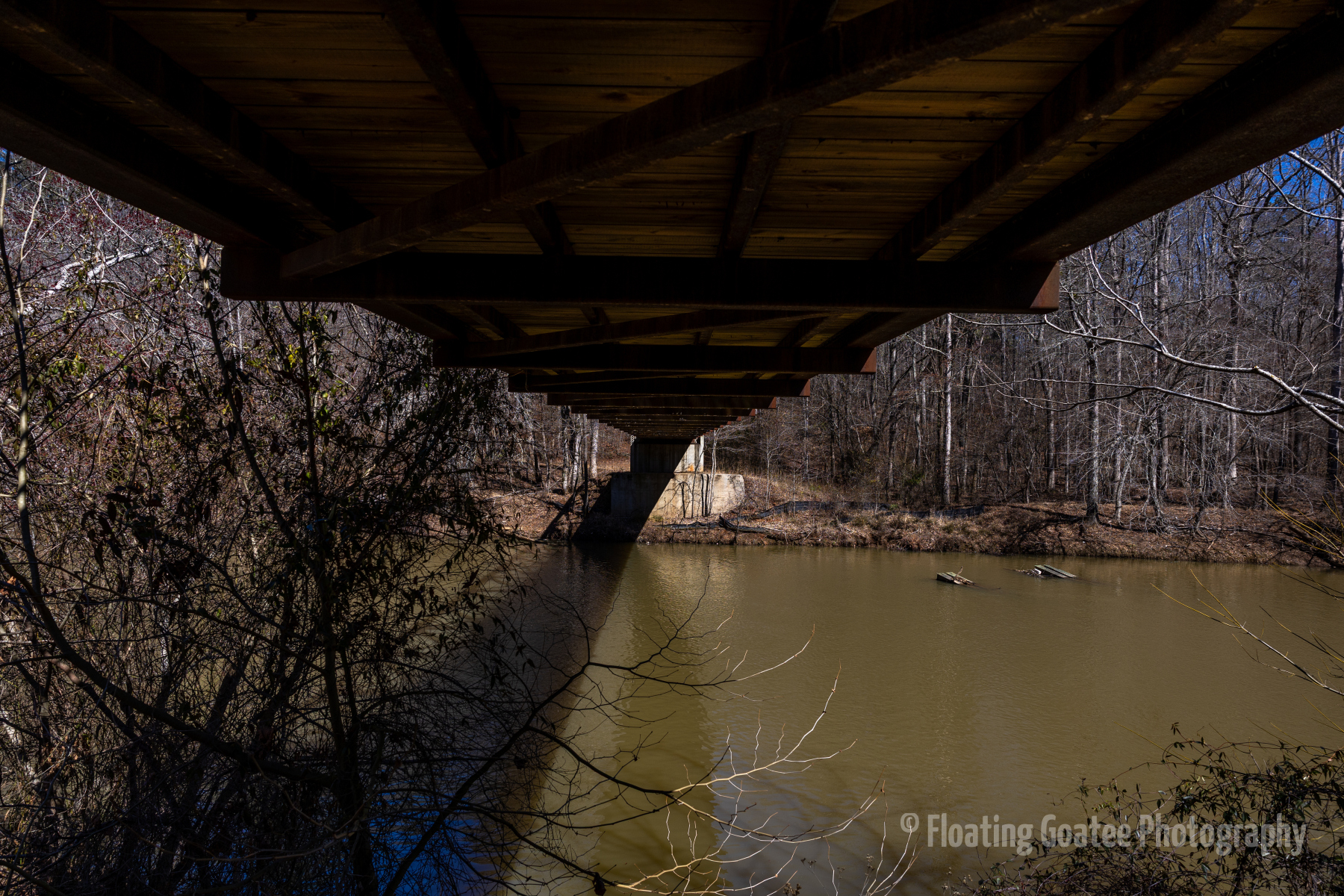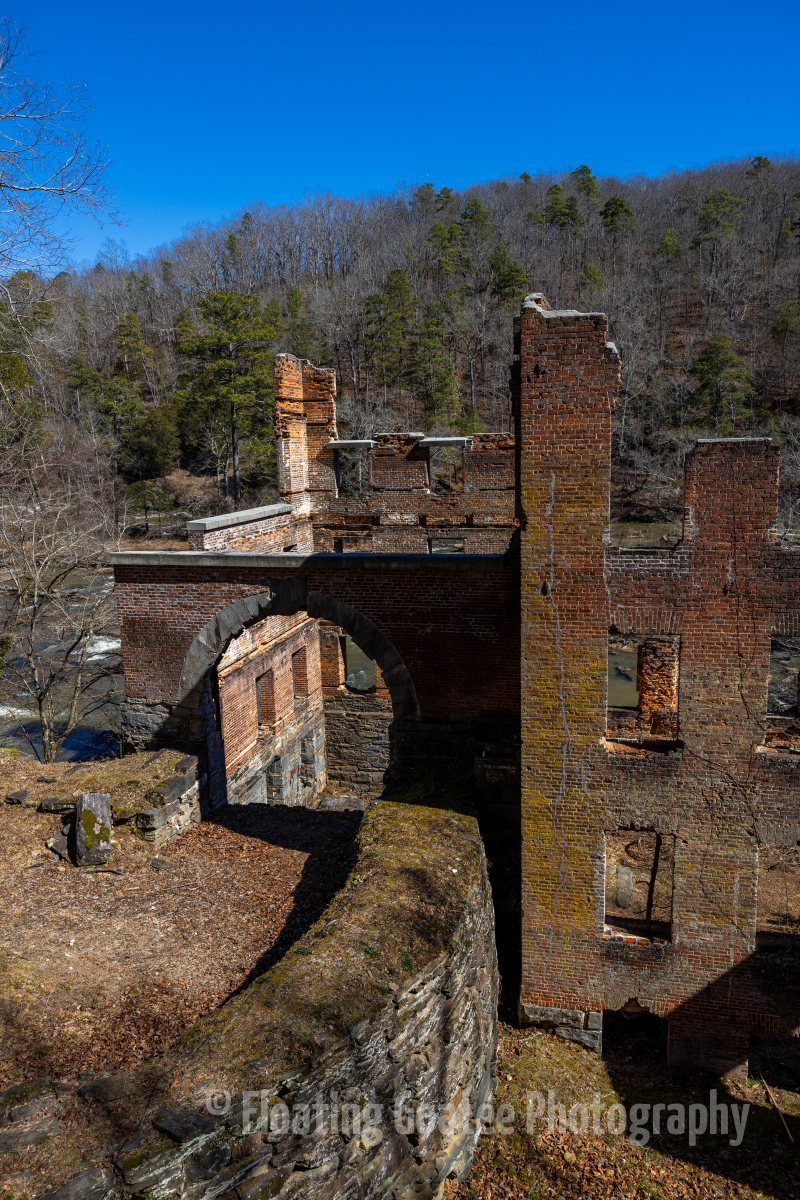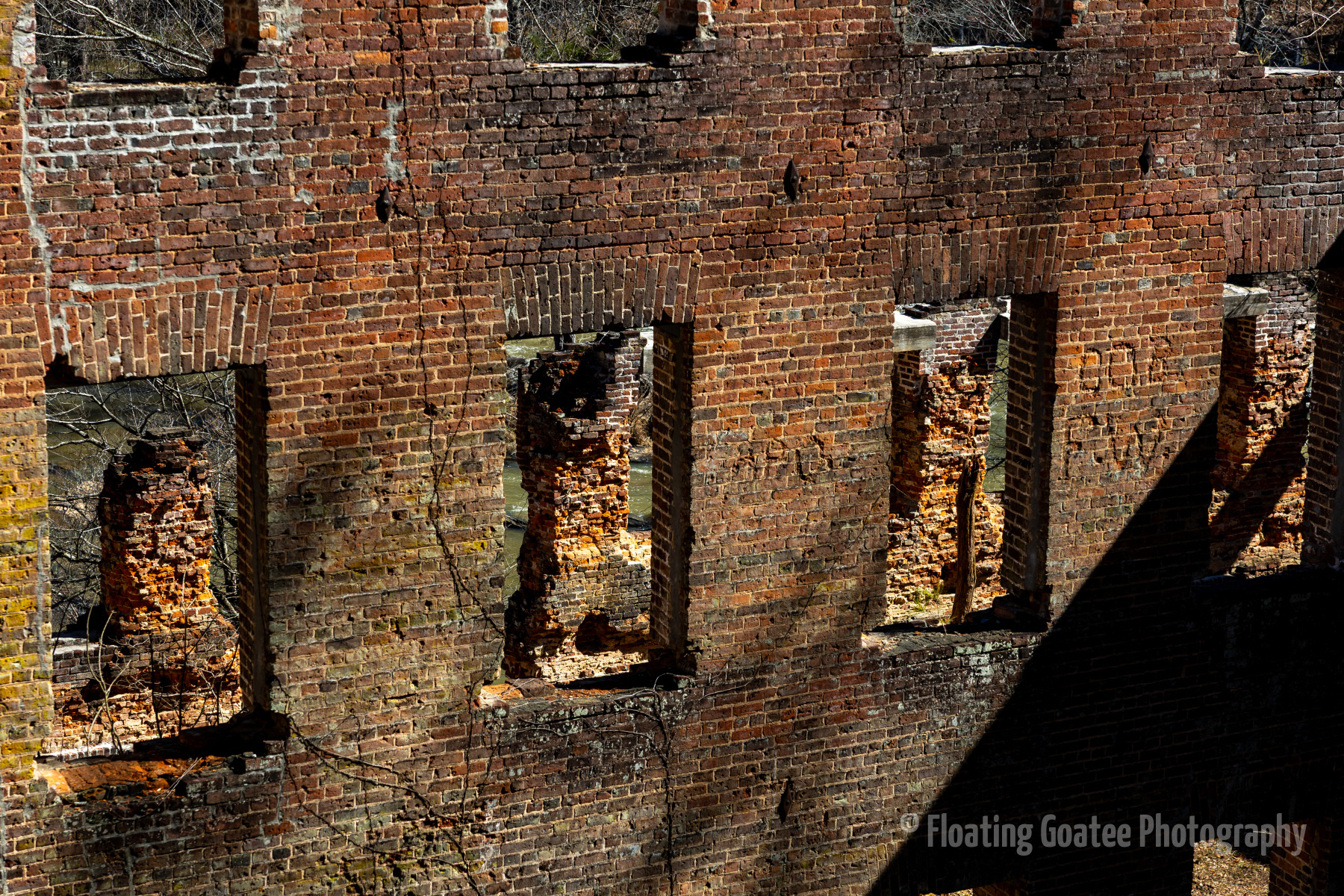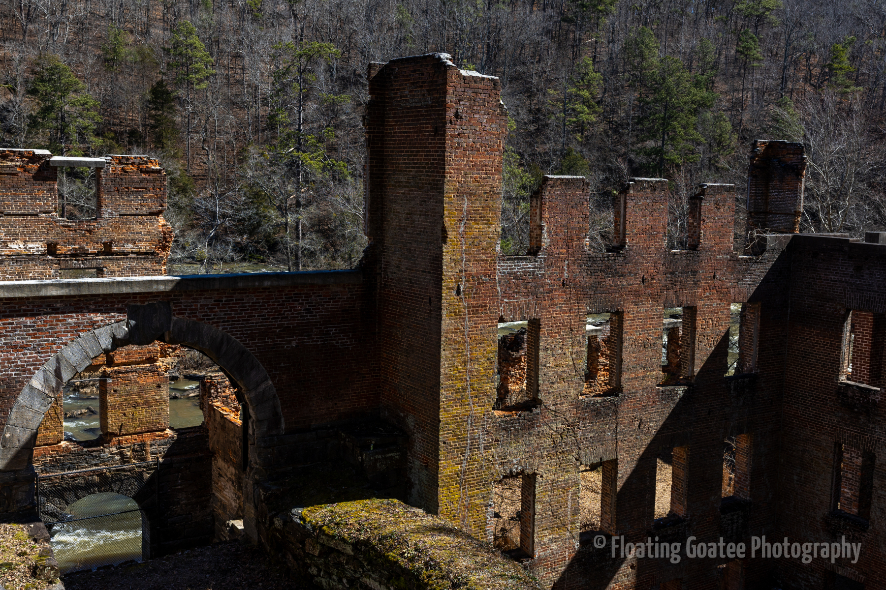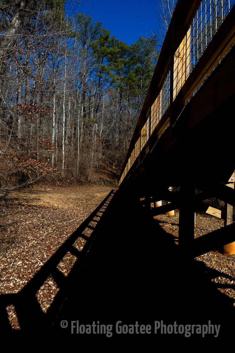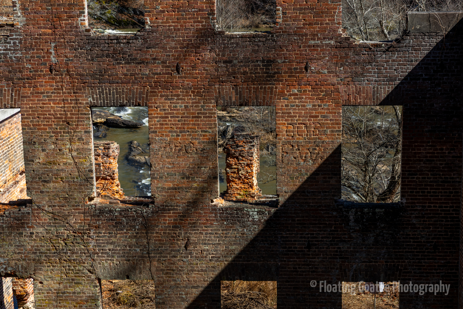 The historic property burned to the ground during the Civil War outside Atlanta. Ruins attract visitors, movies, and television. A rough set of trails and a creek with mild rapids. A pedestrian bridge that spans a wide section of the creek. Some come for the ruins, but the bridge is what captured my attention.