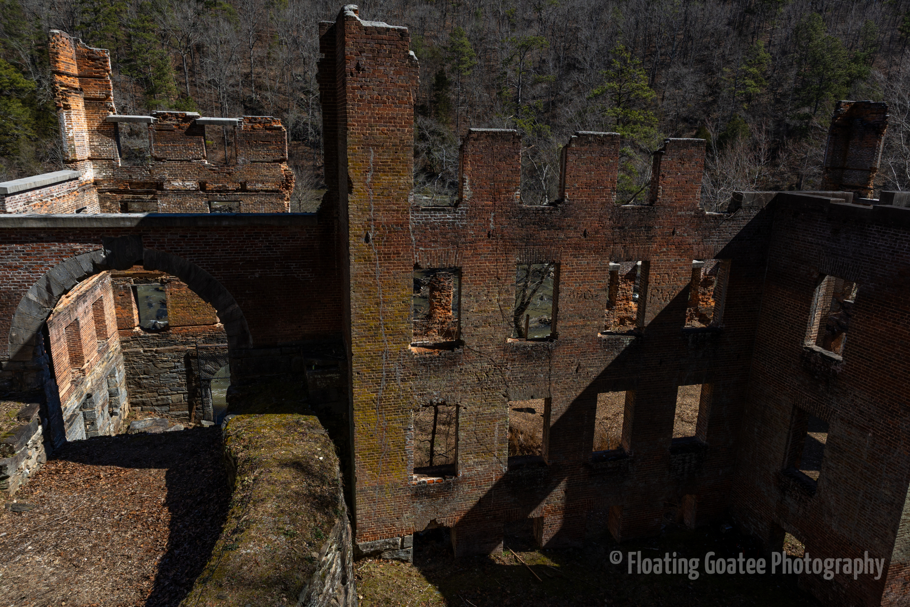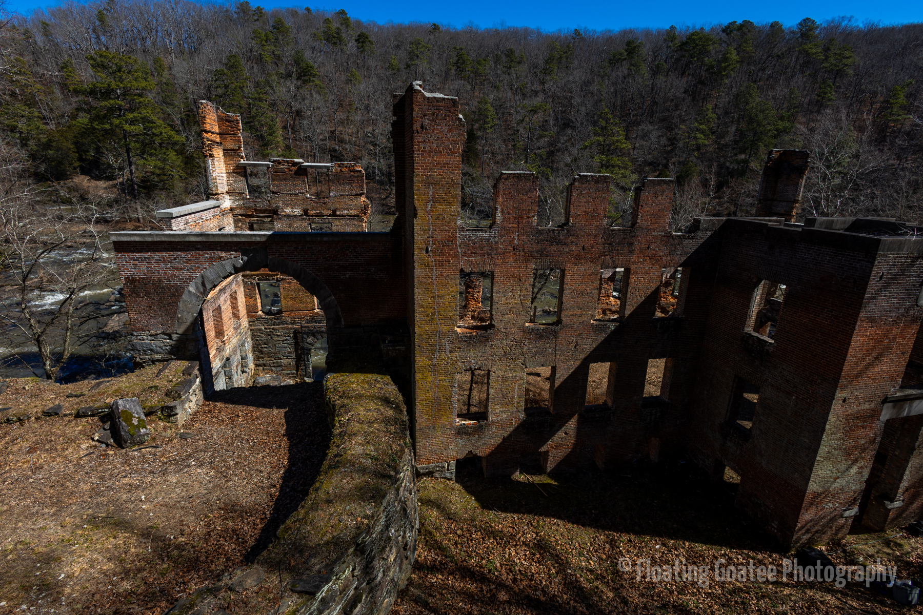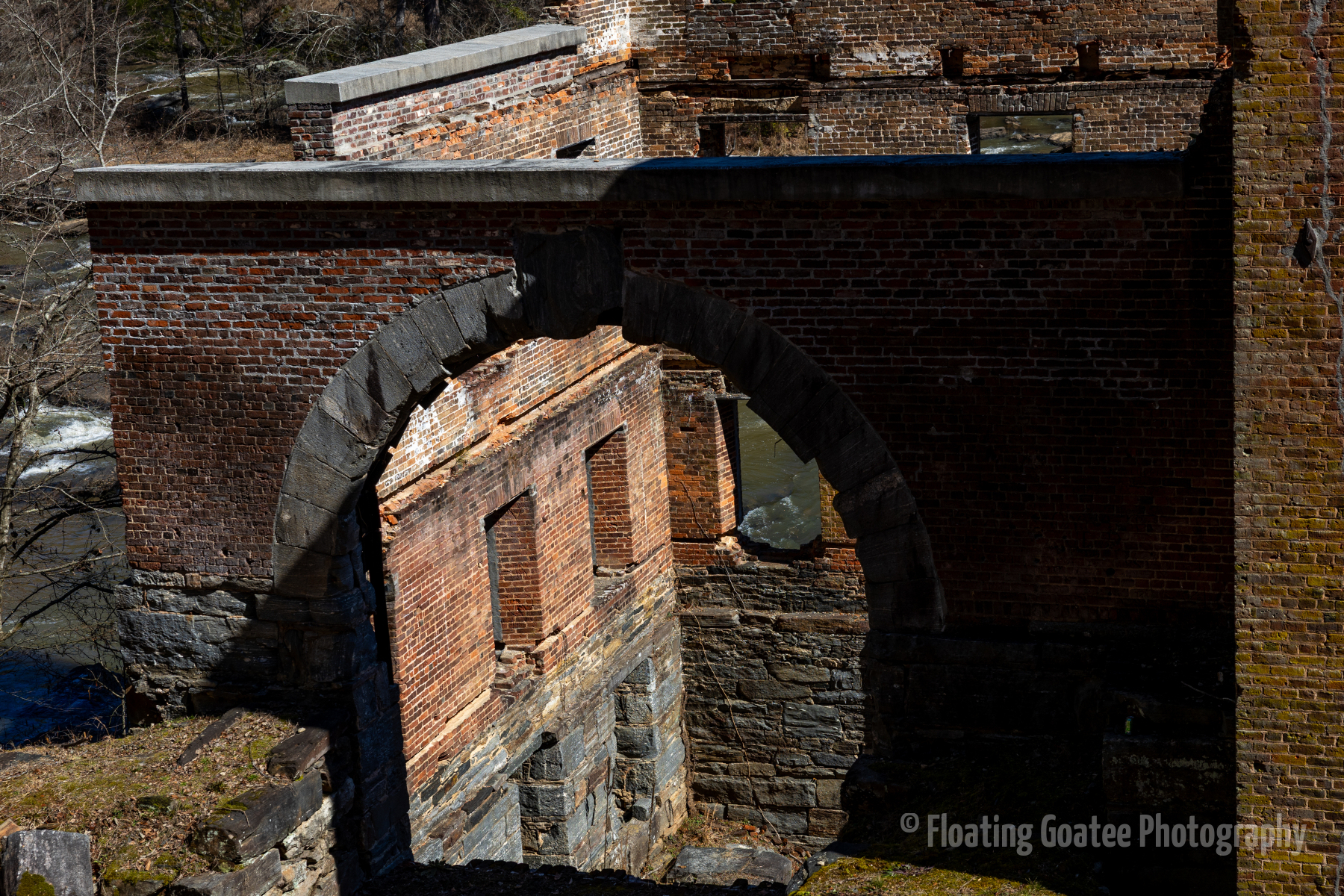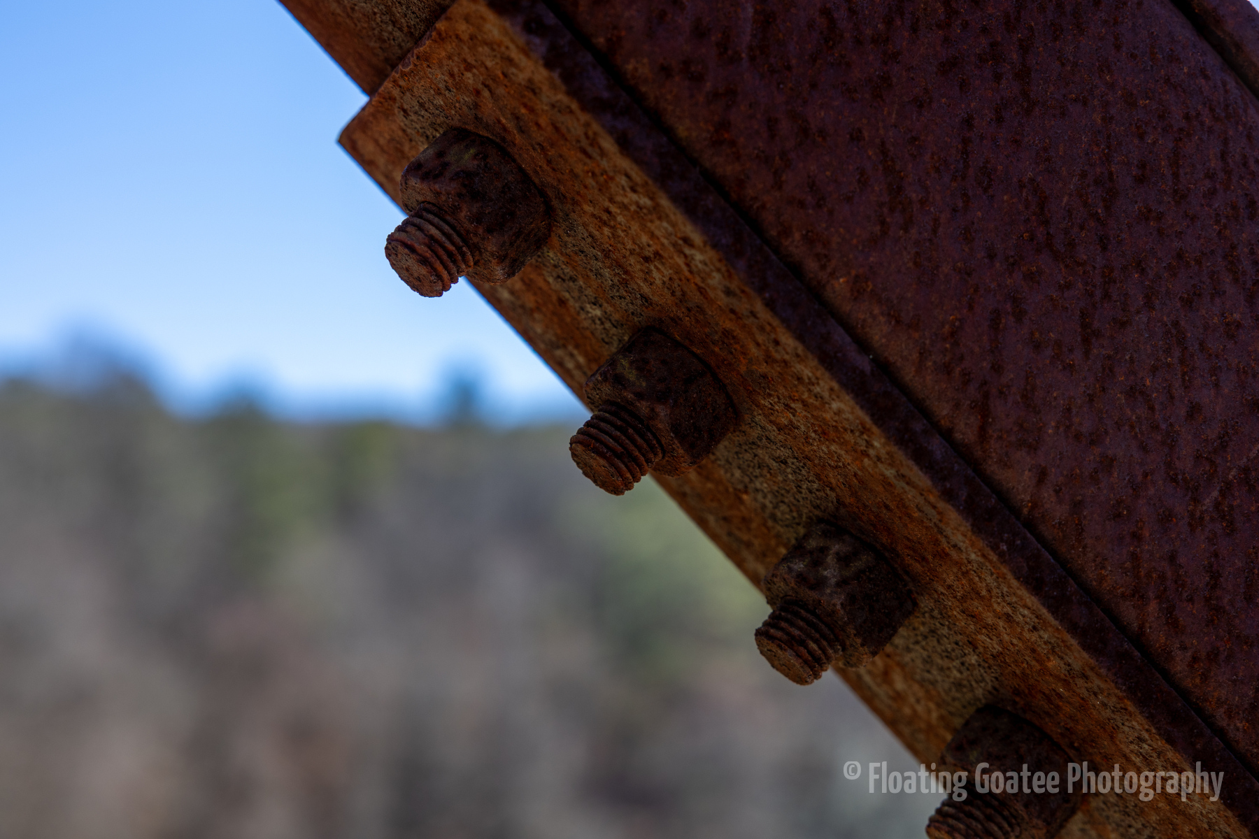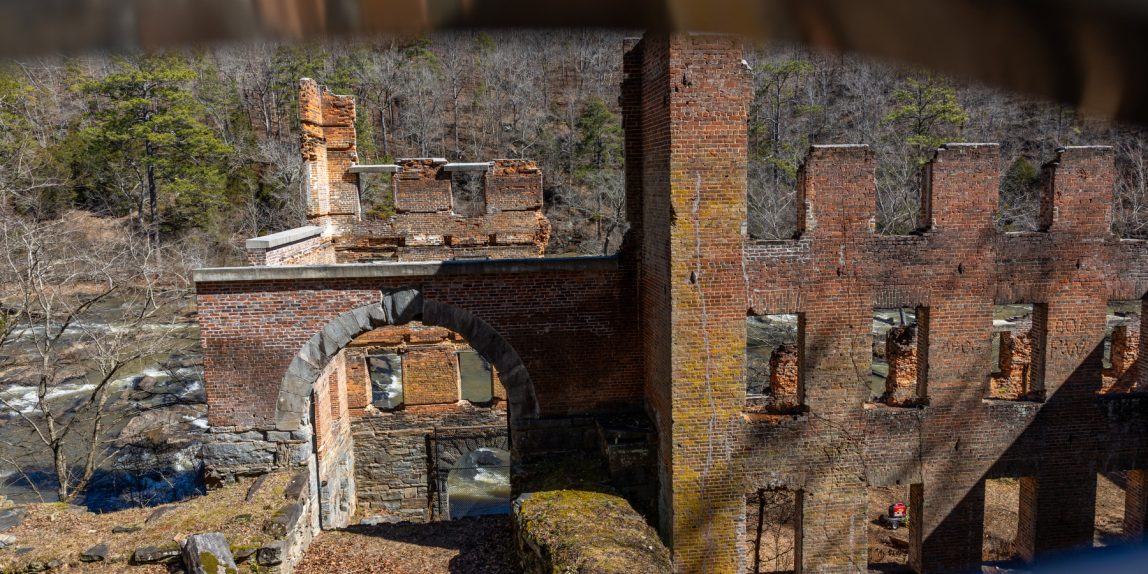 The historic property burned to the ground during the Civil War outside Atlanta. Ruins attract visitors, movies, and television. A rough set of trails and a creek with mild rapids. A pedestrian bridge that spans a wide section of the creek. Some come for the ruins, but the bridge is what captured my attention.