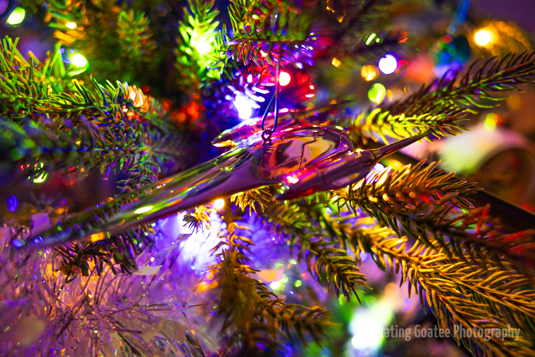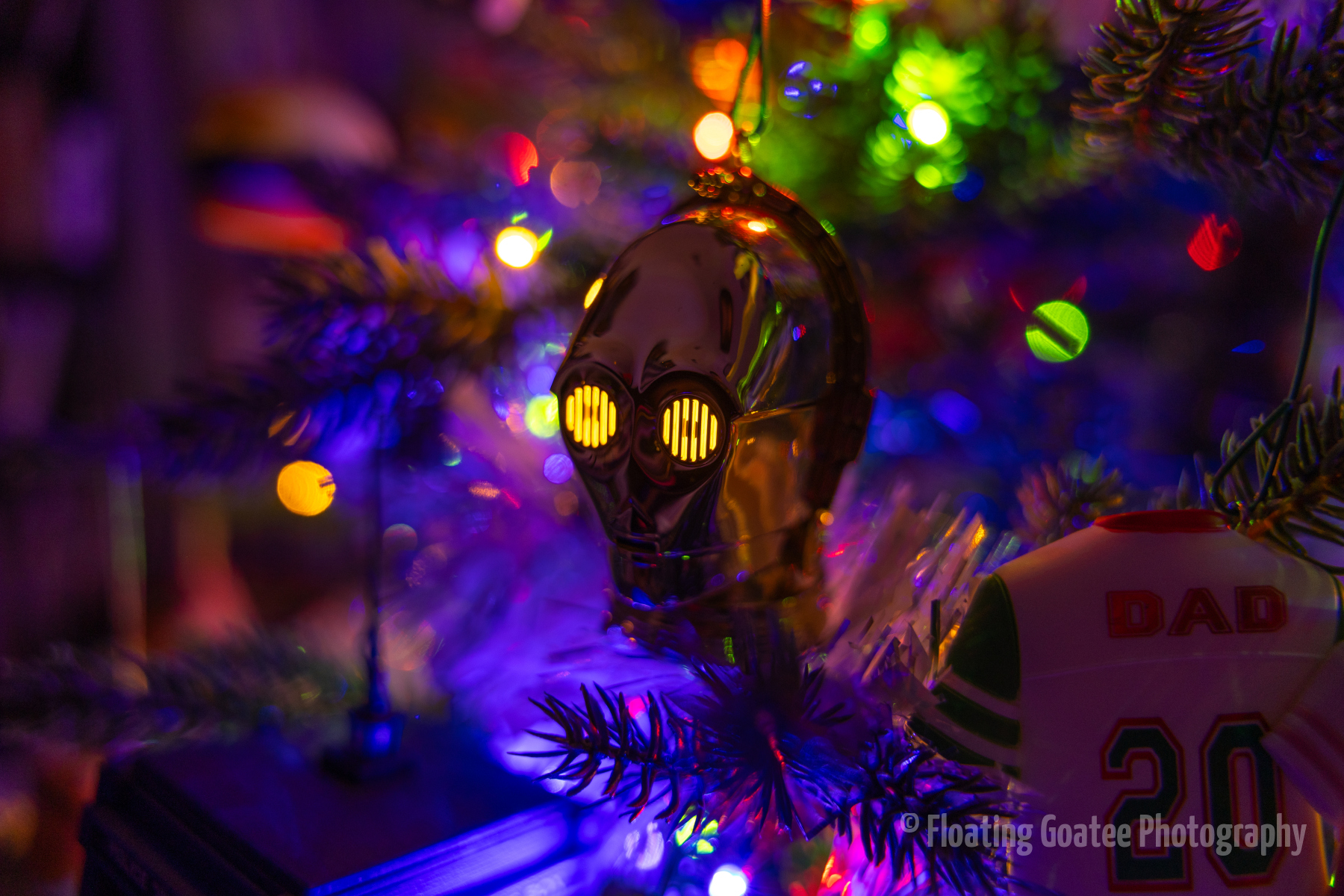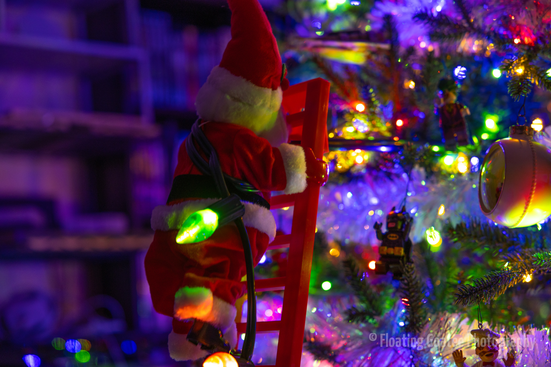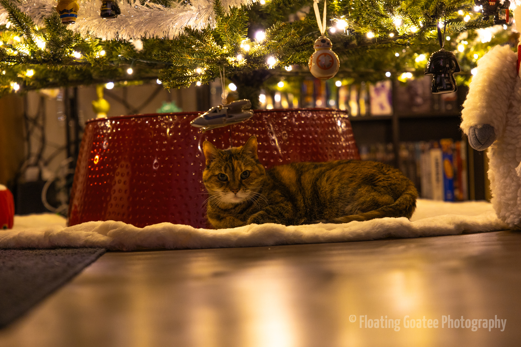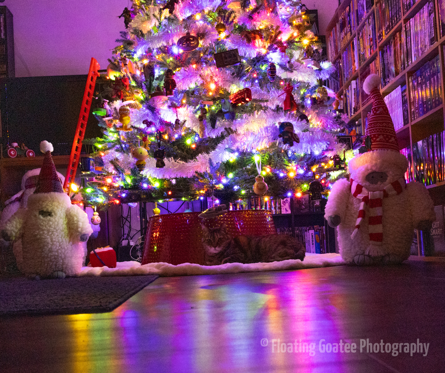 Christmas decorations on the interior of a home. Featuring a Christmas tree, glitter globes, plushies, and other decorations. The rooms are dark and the lights are warmly glowing in red, green, white, and multi-colored hues. A cat enjoys laying underneath the tree. Merry Christmas to all and to all a good night.