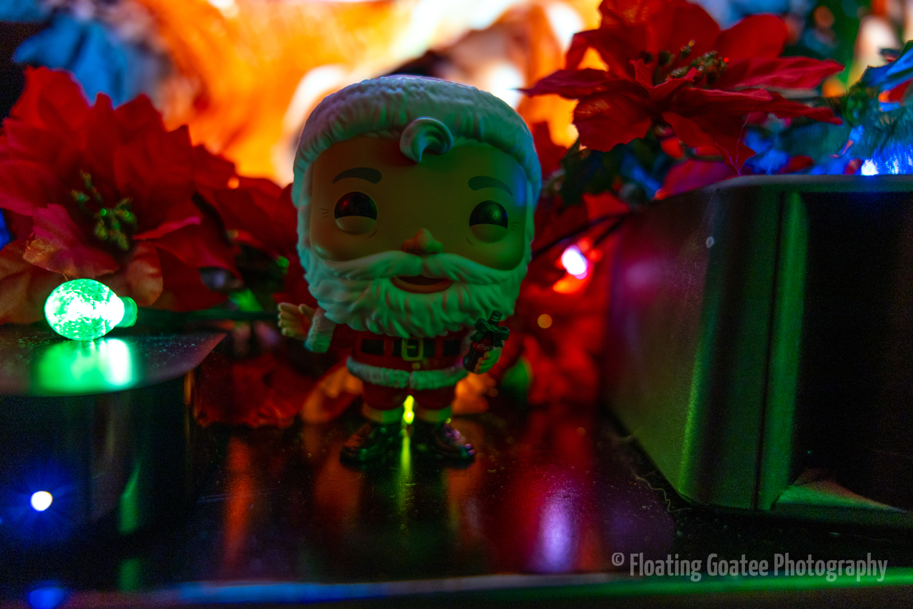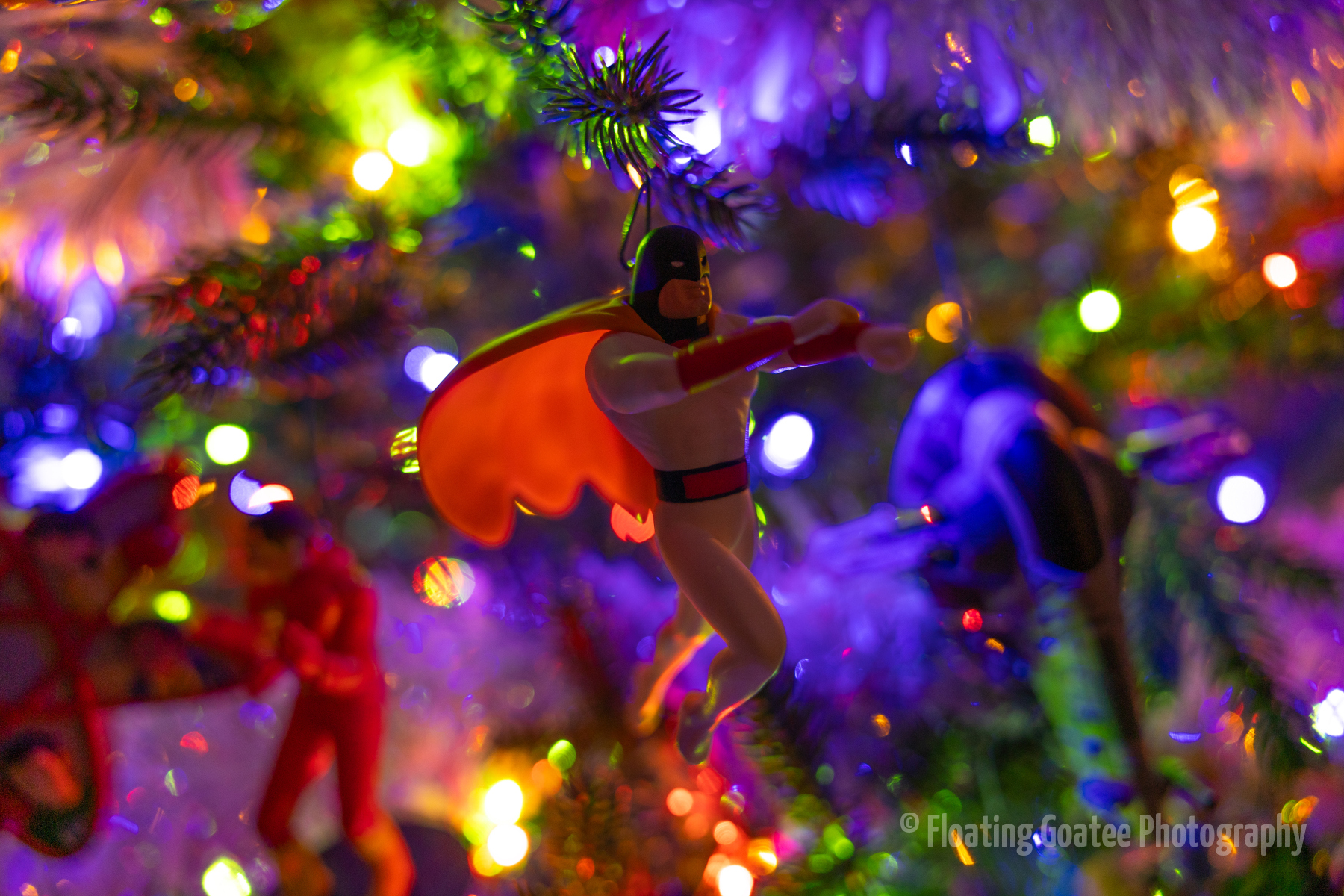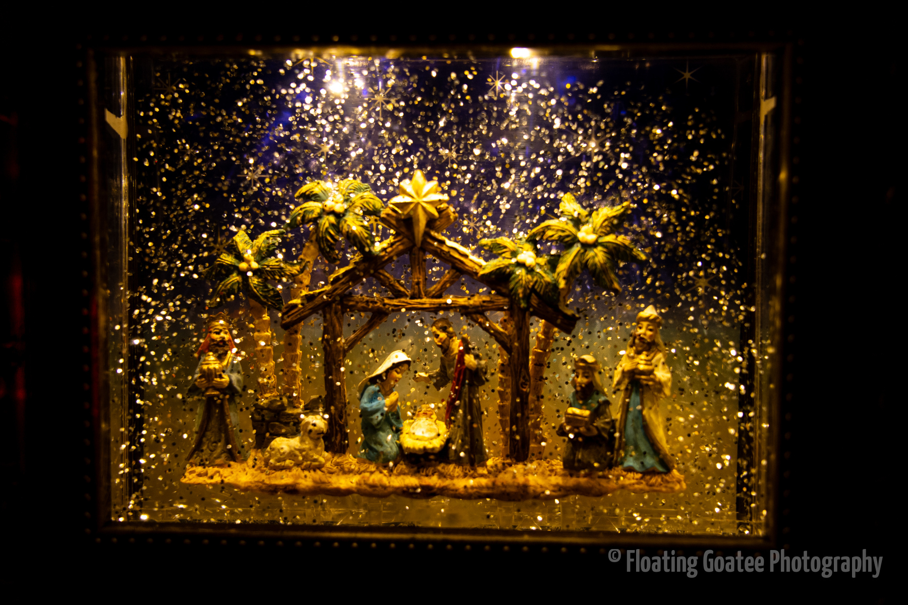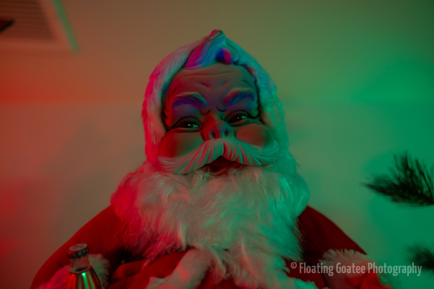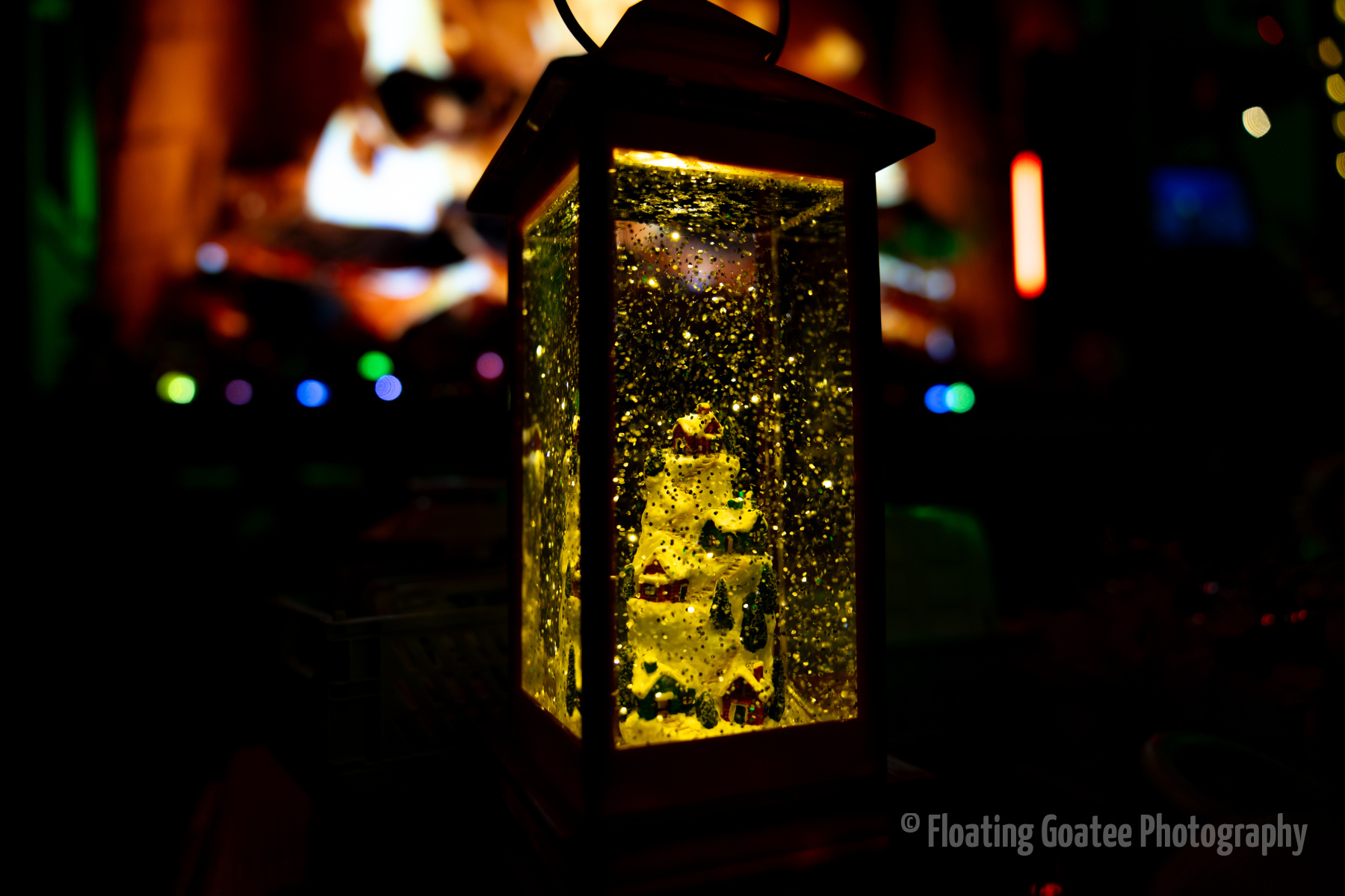 Christmas decorations on the interior of a home. Featuring a Christmas tree, glitter globes, plushies, and other decorations. The rooms are dark and the lights are warmly glowing in red, green, white, and multi-colored hues. A cat enjoys laying underneath the tree. Merry Christmas to all and to all a good night.