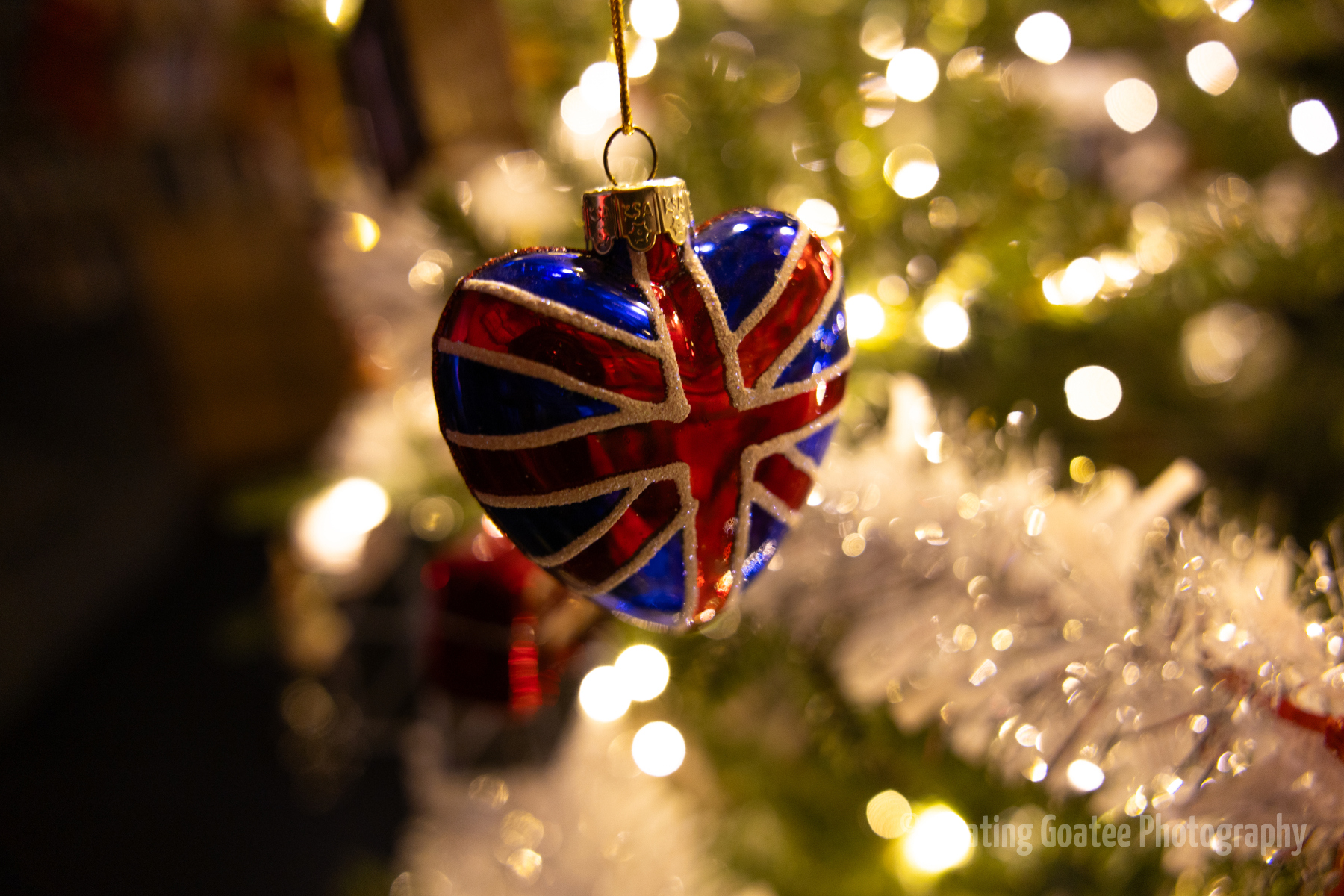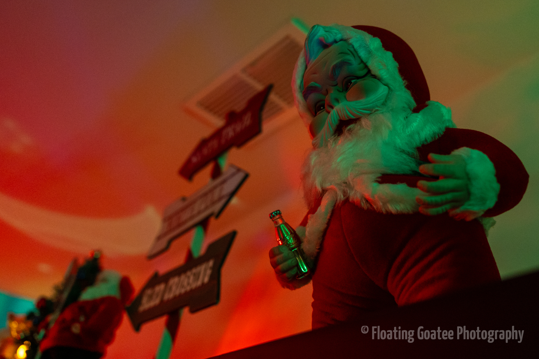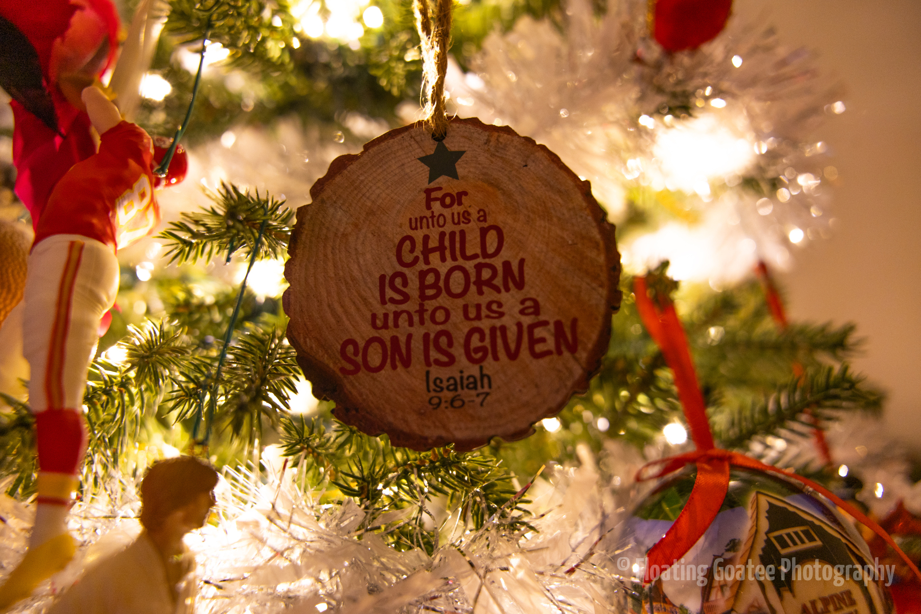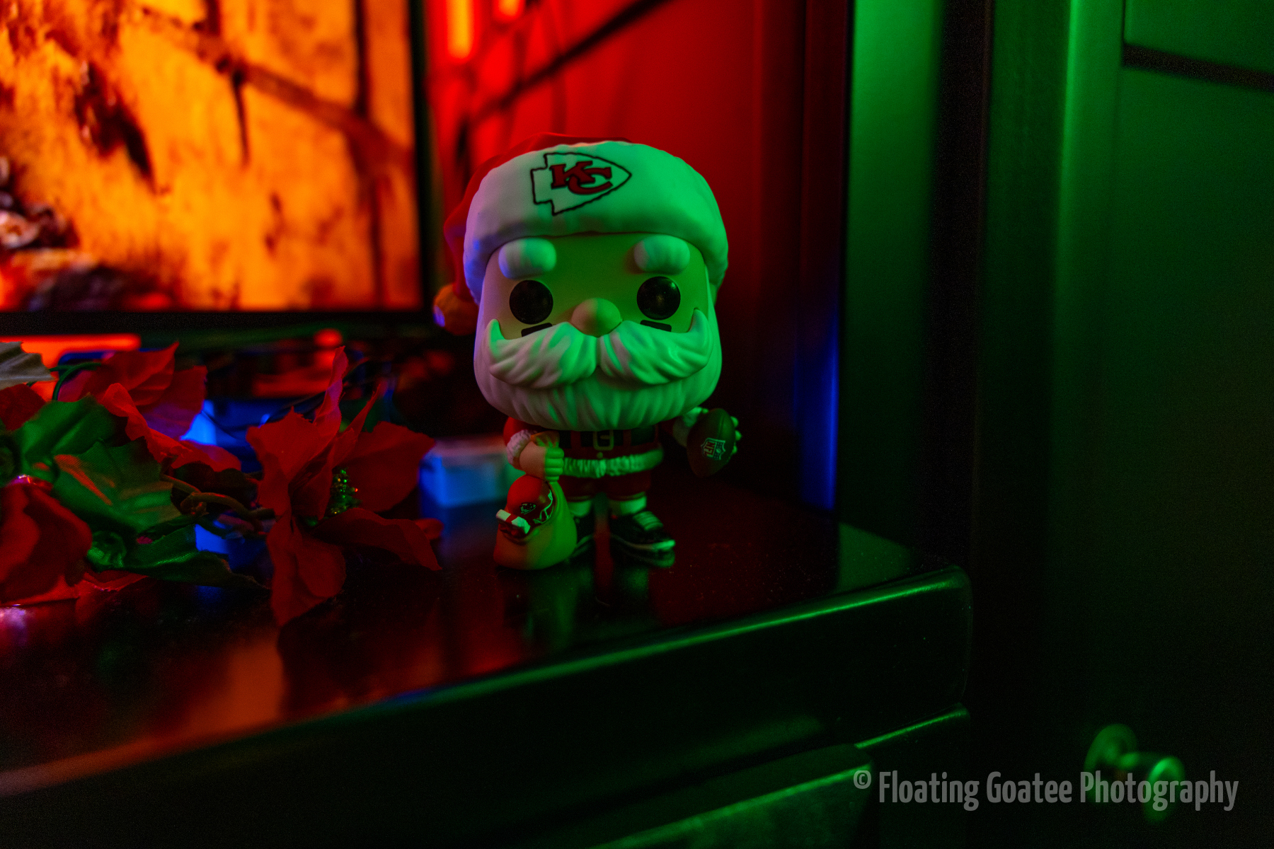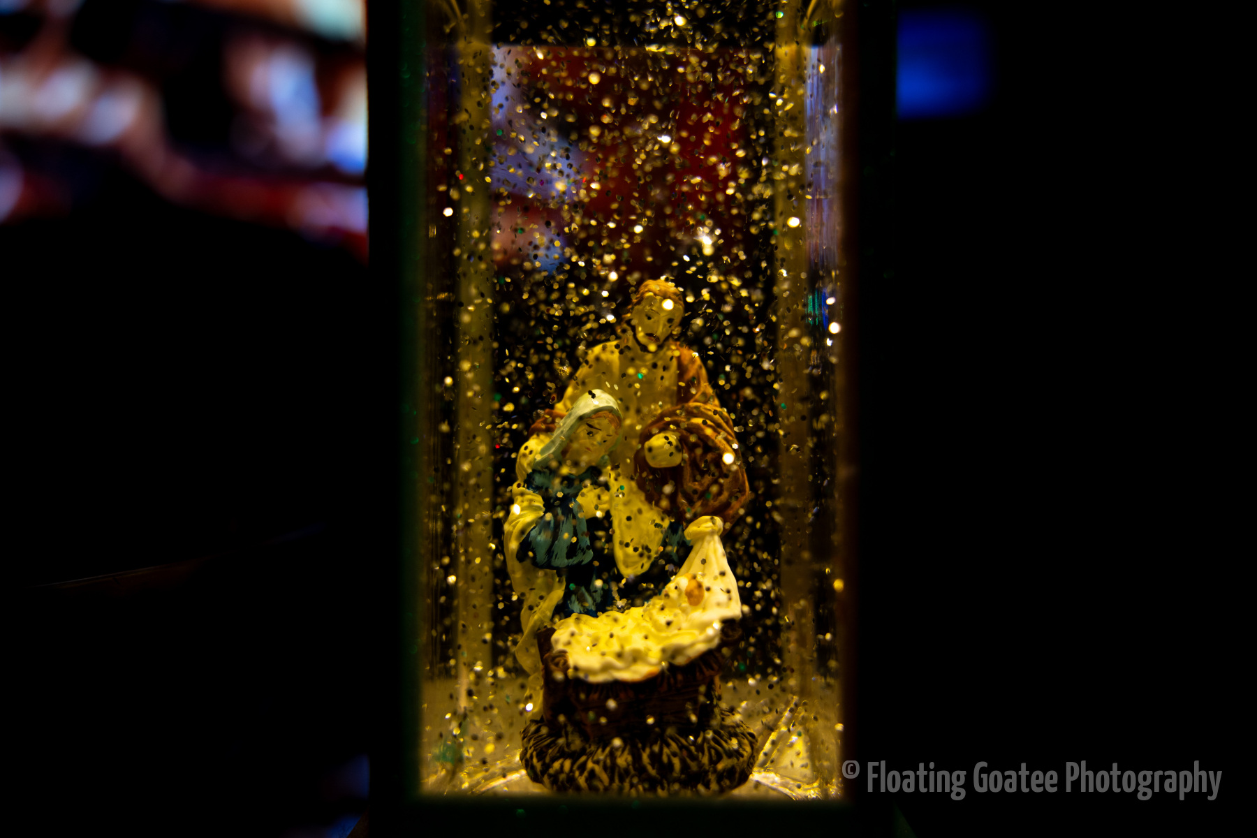 Christmas decorations on the interior of a home. Featuring a Christmas tree, glitter globes, plushies, and other decorations. The rooms are dark and the lights are warmly glowing in red, green, white, and multi-colored hues. A cat enjoys laying underneath the tree. Merry Christmas to all and to all a good night.