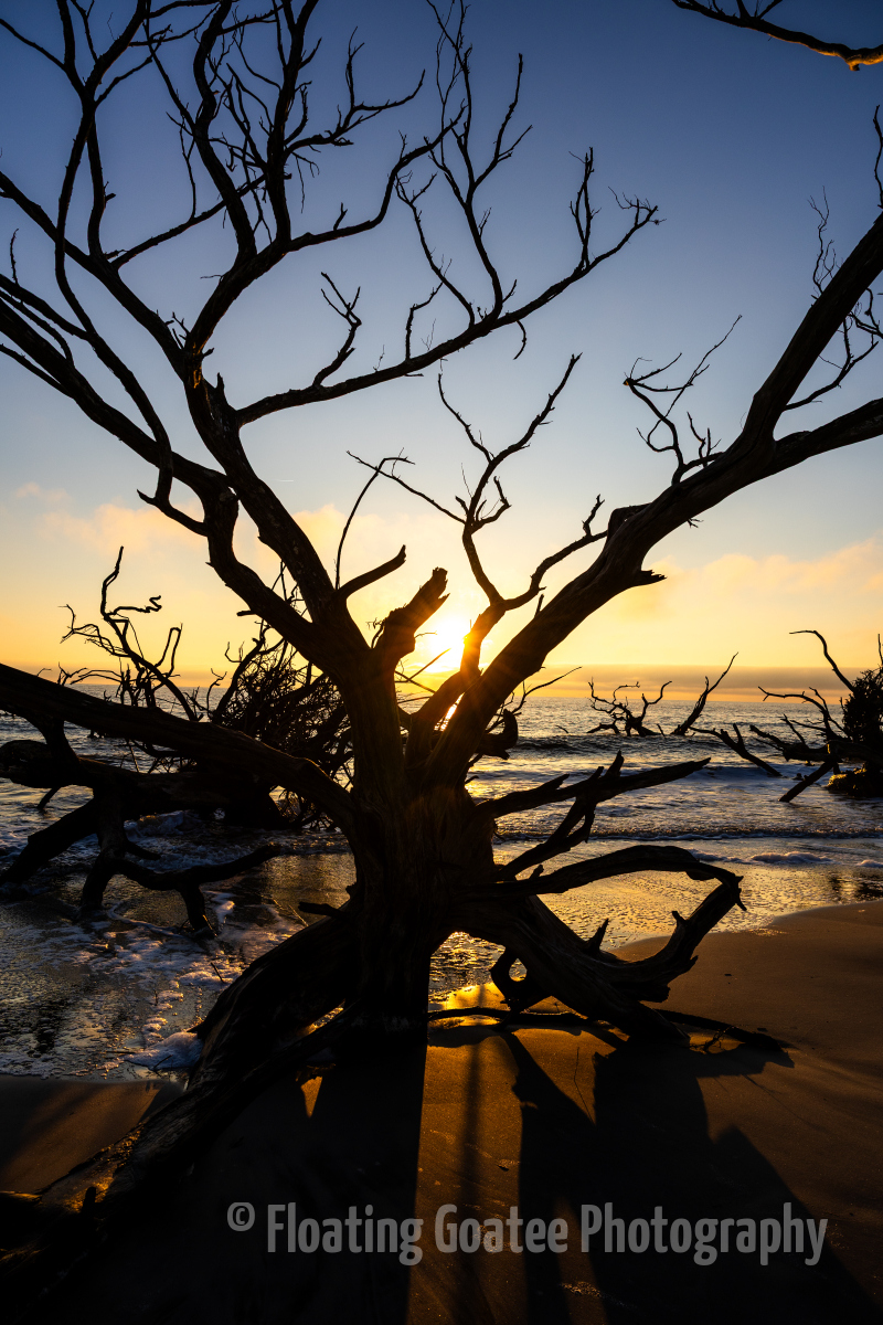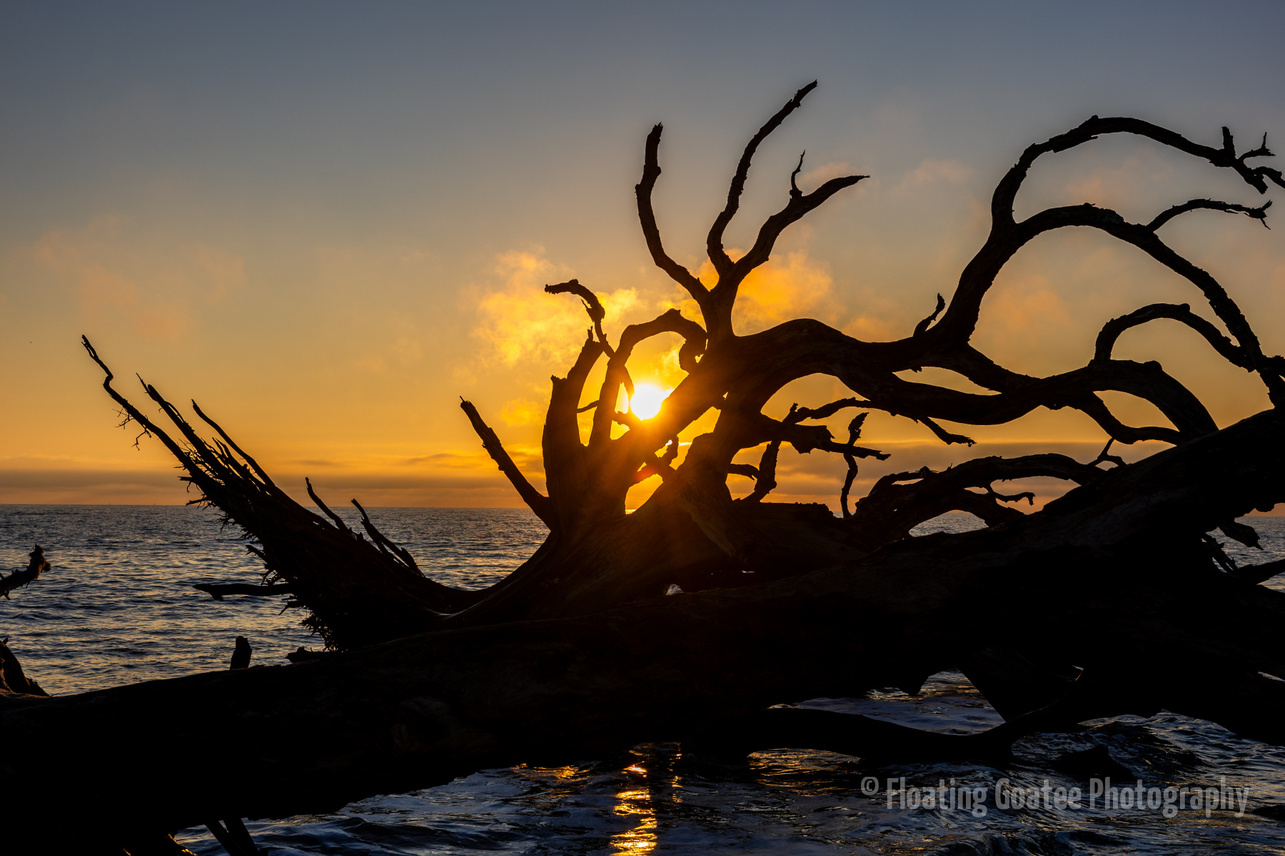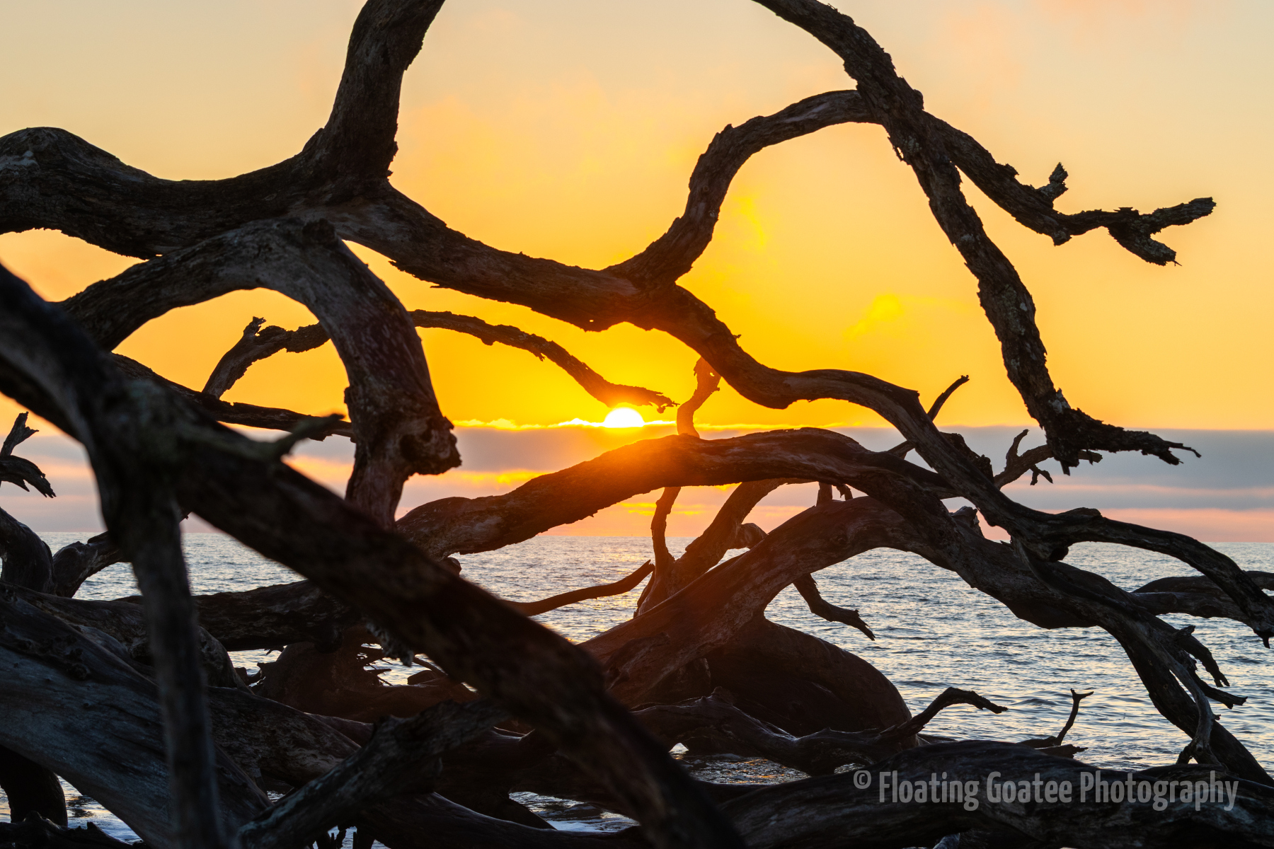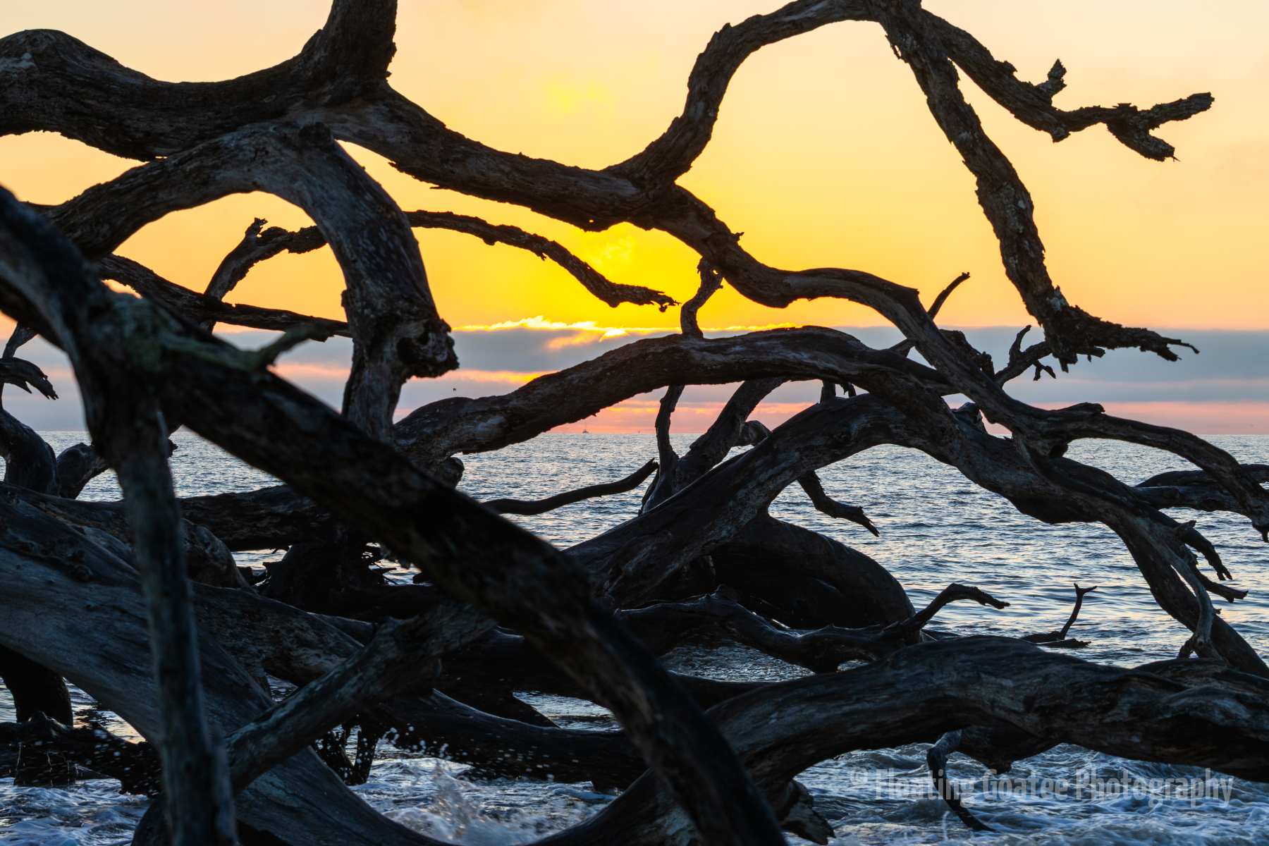 Sunrise along a surreal beach. Dead trees bathed in the sun and sea. The colors are intense. The tide is high. The foam of the waves washes upon the shore. Various people gather to take in the start of a new day. There is nothing quite as majestic as the sun rising over the sea along the Jekyll Island driftwood beach.