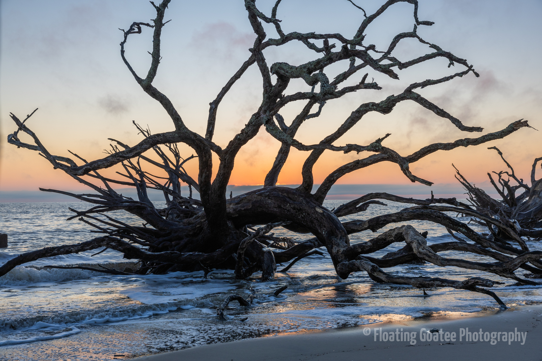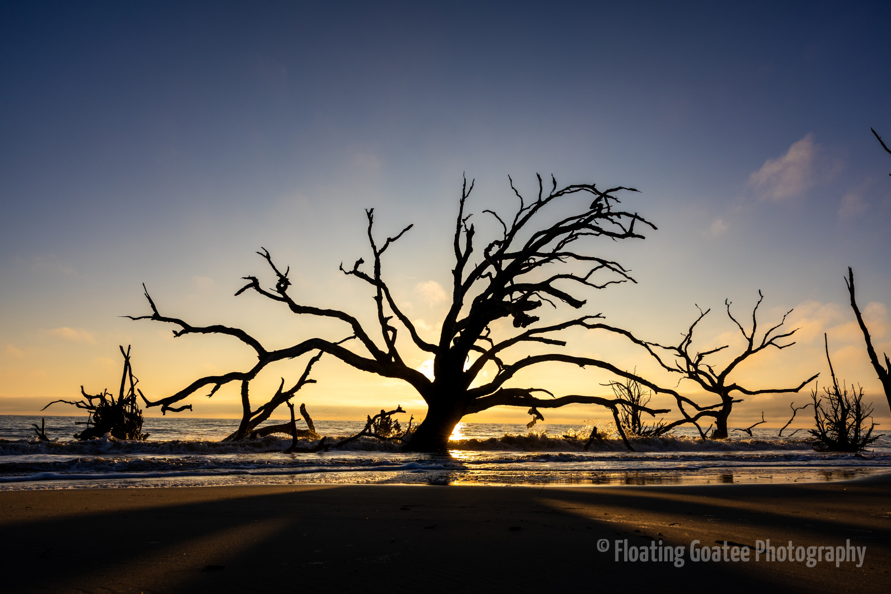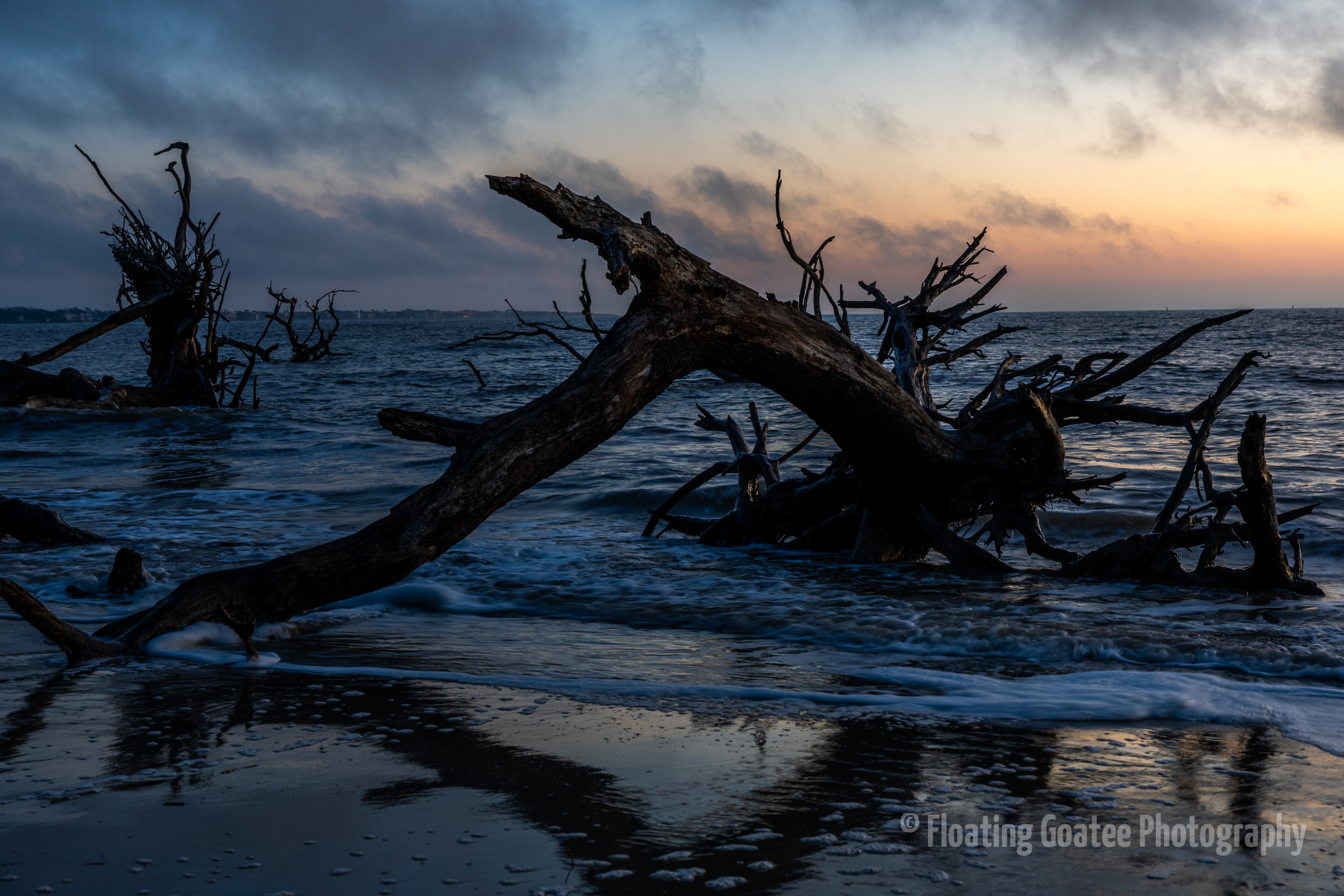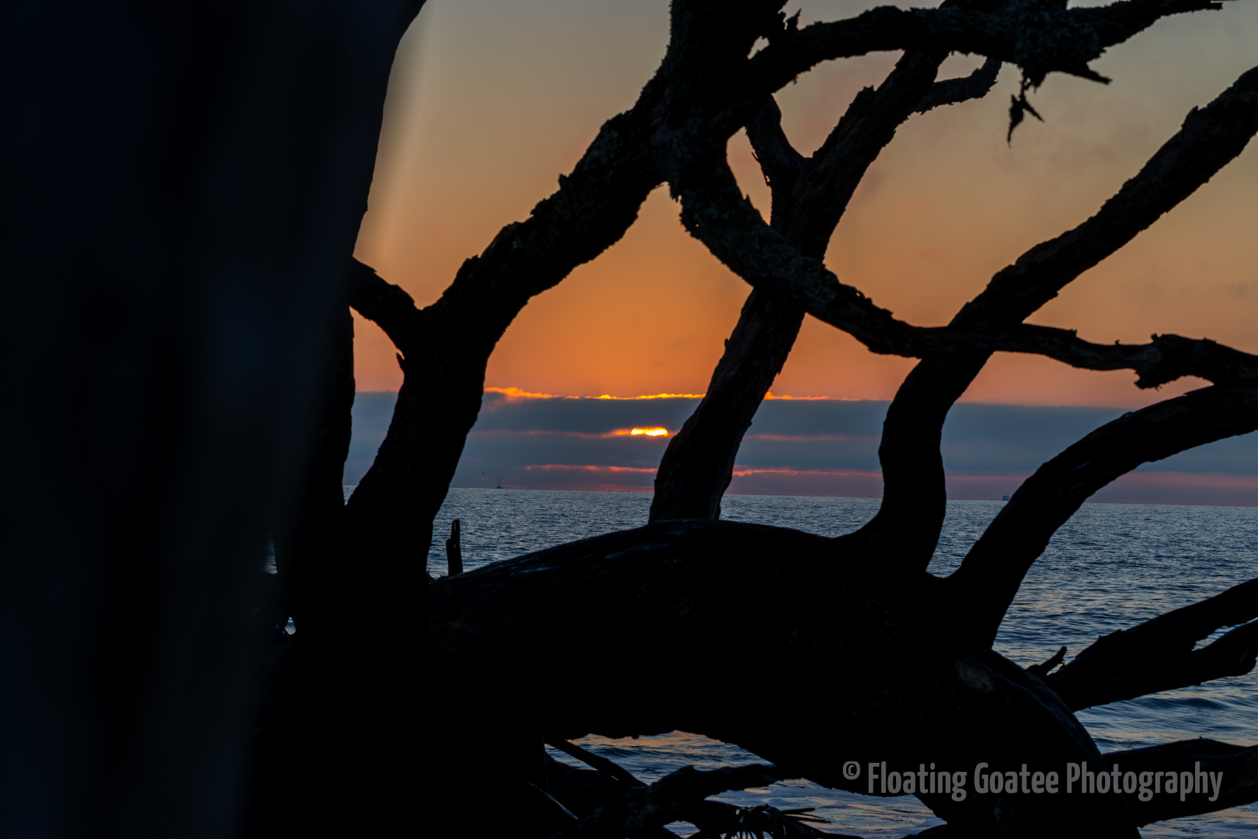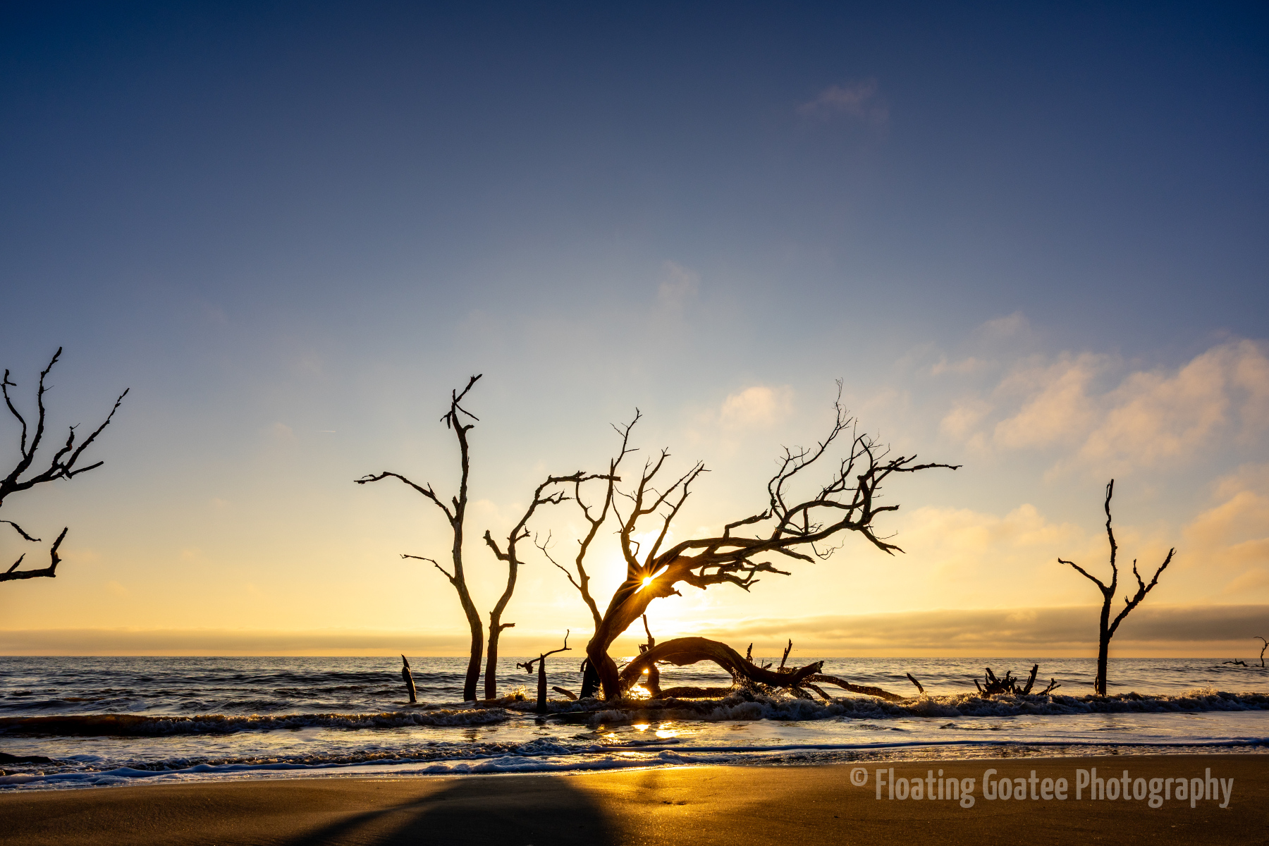 Sunrise along a surreal beach. Dead trees bathed in the sun and sea. The colors are intense. The tide is high. The foam of the waves washes upon the shore. Various people gather to take in the start of a new day. There is nothing quite as majestic as the sun rising over the sea along the Jekyll Island driftwood beach.