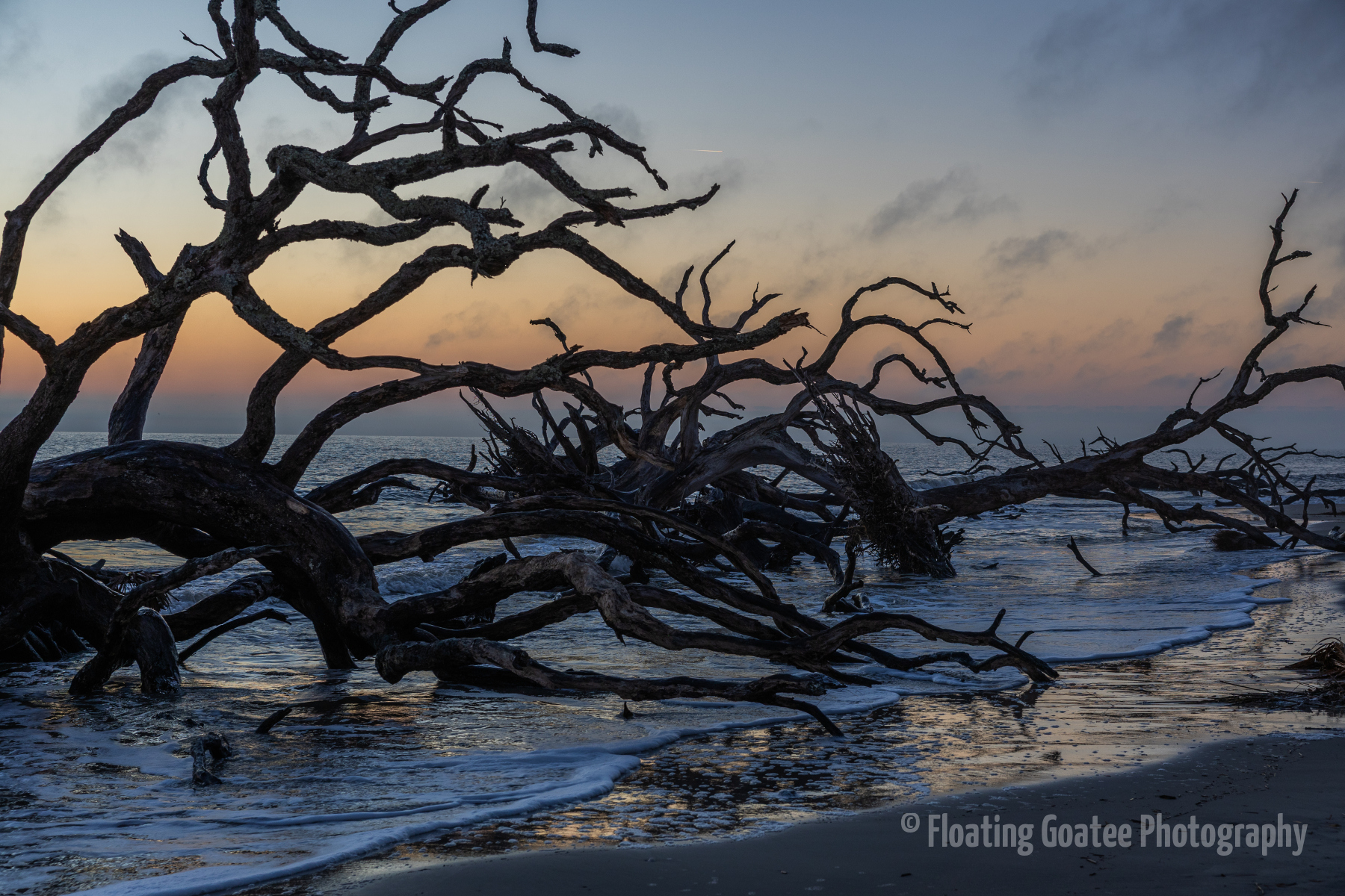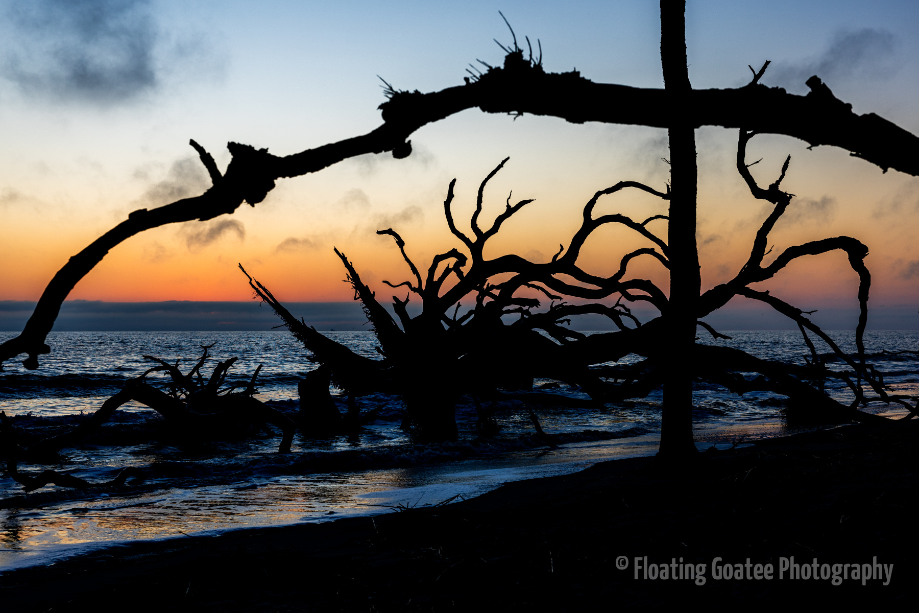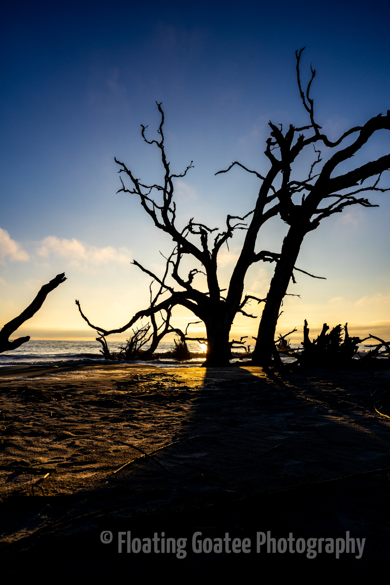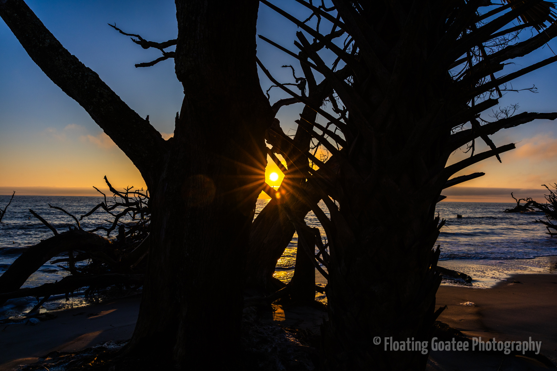 Sunrise along a surreal beach. Dead trees bathed in the sun and sea. The colors are intense. The tide is high. The foam of the waves washes upon the shore. Various people gather to take in the start of a new day. There is nothing quite as majestic as the sun rising over the sea along the Jekyll Island driftwood beach.