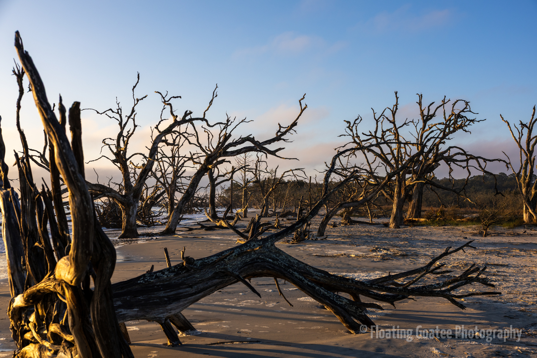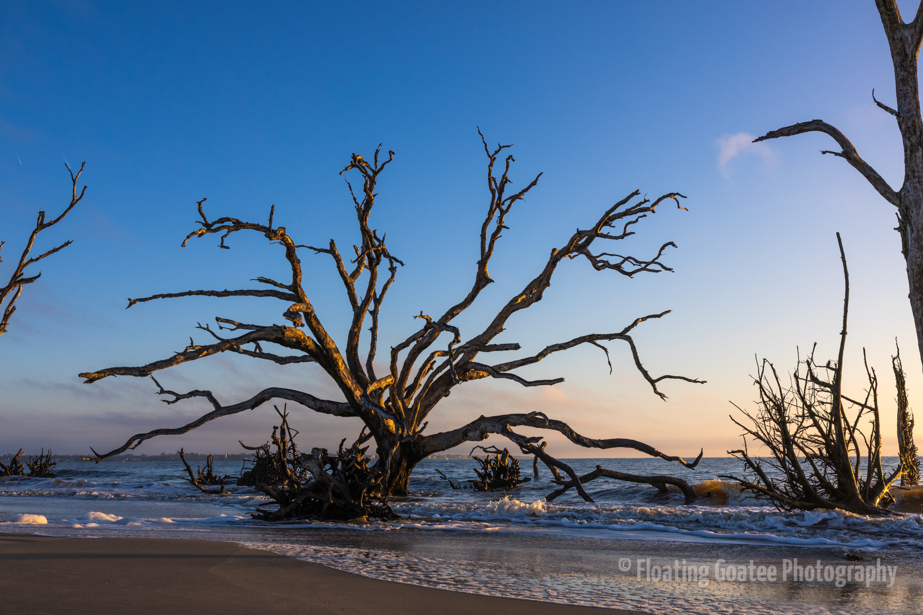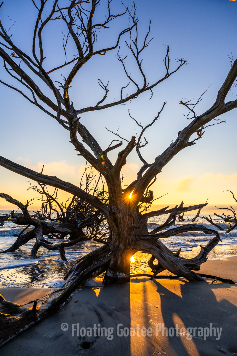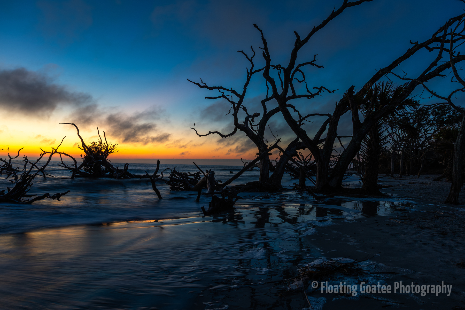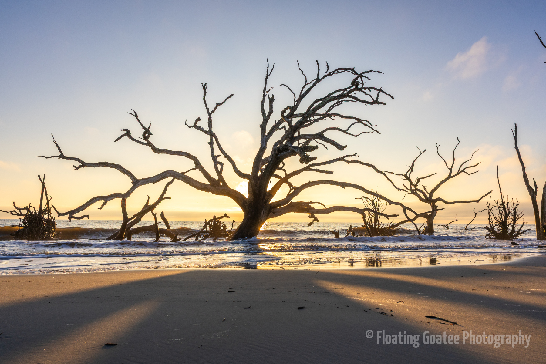 Sunrise along a surreal beach. Dead trees bathed in the sun and sea. The colors are intense. The tide is high. The foam of the waves washes upon the shore. Various people gather to take in the start of a new day. There is nothing quite as majestic as the sun rising over the sea along the Jekyll Island driftwood beach.