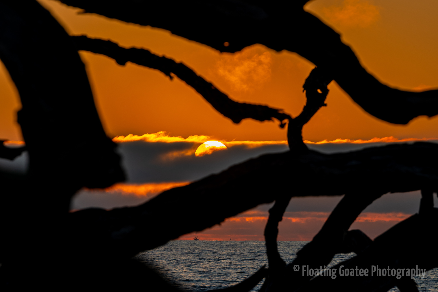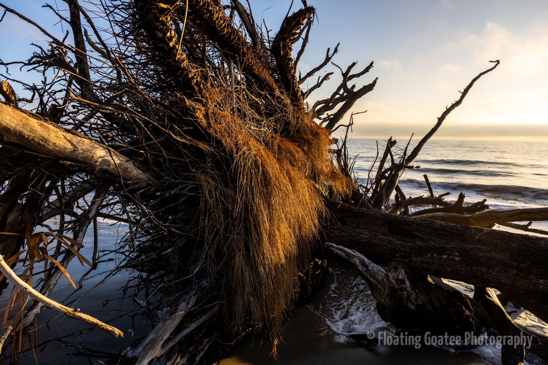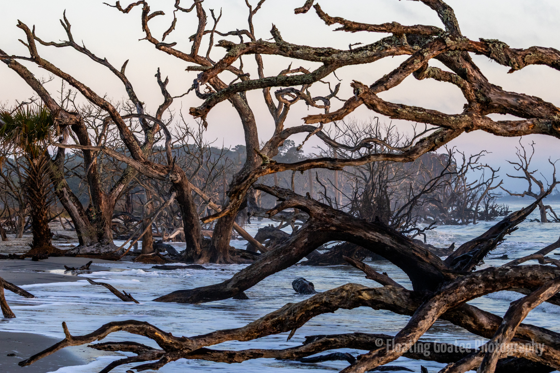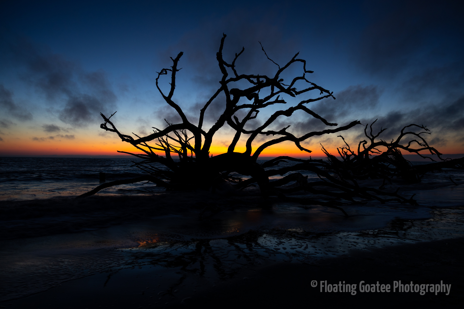 Sunrise along a surreal beach. Dead trees bathed in the sun and sea. The colors are intense. The tide is high. The foam of the waves washes upon the shore. Various people gather to take in the start of a new day. There is nothing quite as majestic as the sun rising over the sea along the Jekyll Island driftwood beach.